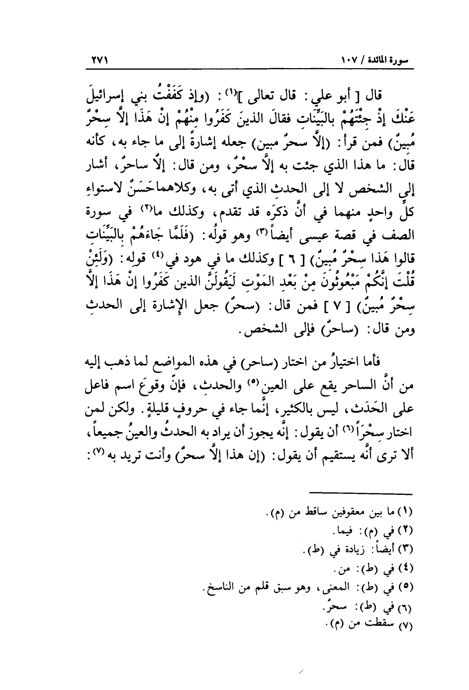 قال [أبو علي: قال تعالى] «1»: وإذ كففت بني إسرائيل عنك إذ جئتهم بالبينات فقال الذين كفروا منهم إن هذا إلا سحر مبين فمن قرأ: إلا سحر مبين جعله إشارة إلى ما جاء به، كأنه قال: ما هذا الذي جئت به إلّا سحر، ومن قال: إلا ساحر، أشار إلى الشخص لا إلى الحدث الذي أتى به، وكلاهما حسن لاستواء كلّ واحد منهما في أنّ ذكره قد تقدم، وكذلك ما «2» في سورة الصف في قصة عيسى أيضا «3» وهو قوله: فلما جاءهم بالبينات قالوا هذا سحر مبين [6] وكذلك ما في هود في «4» قوله: ولئن قلت إنكم مبعوثون من بعد الموت ليقولن الذين كفروا إن هذا إلا سحر مبين [7] فمن قال: سحر جعل الإشارة إلى الحدث ومن قال: ساحر فإلى الشخص.
