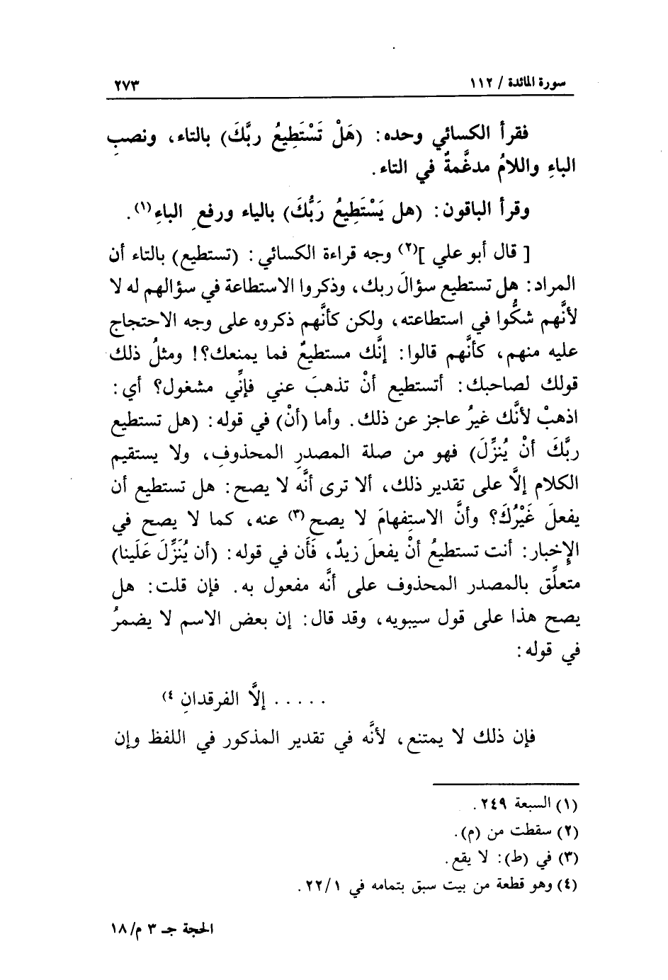 [قال أبو علي] «2» وجه قراءة الكسائي: تستطيع* بالتاء أن المراد: هل تستطيع سؤال ربك، وذكروا الاستطاعة في سؤالهم له لا لأنّهم شكّوا في استطاعته، ولكن كأنّهم ذكروه على وجه الاحتجاج عليه منهم، كأنّهم قالوا: إنّك مستطيع فما يمنعك؟! ومثل ذلك قولك لصاحبك: أتستطيع أن تذهب عني فإنّي مشغول؟ أي:
