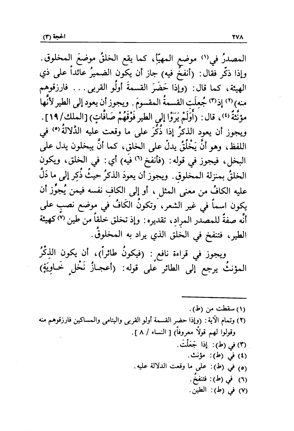 وإذا ذكّر فقال: أنفخ فيه جاز أن يكون الضمير عائدا على ذي الهيئة، كما قال: وإذا حضر القسمة أولوا القربى ... فارزقوهم منه «2» إذ «3» جعلت القسمة المقسوم. ويجوز أن يعود إلى الطير لأنّها مؤنّثة «4»، قال: أولم يروا إلى الطير فوقهم صافات [الملك/ 19].