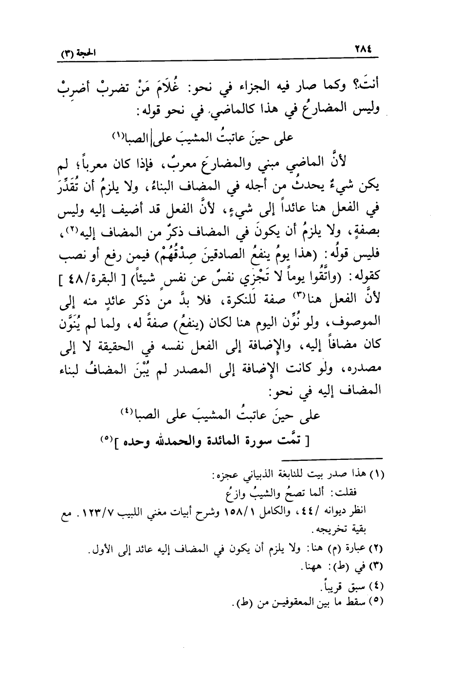 على حين عاتبت المشيب على الصبا «1» لأنّ الماضي مبني والمضارع معرب، فإذا كان معربا، لم يكن شيء يحدث من أجله في المضاف البناء، ولا يلزم أن تقدّر في الفعل هنا عائدا إلى شيء، لأنّ الفعل قد أضيف إليه وليس بصفة، ولا يلزم أن يكون في المضاف ذكر من المضاف إليه «2»، فليس قوله: هذا يوم ينفع الصادقين صدقهم فيمن رفع أو نصب كقوله: واتقوا يوما لا تجزي نفس عن نفس شيئا [البقرة/ 48] لأنّ الفعل هنا «3» صفة للنكرة، فلا بدّ من ذكر عائد منه إلى الموصوف، ولو نوّن اليوم هنا لكان ينفع صفة له، ولما لم ينوّن كان مضافا إليه، والإضافة إلى الفعل نفسه في الحقيقة لا إلى مصدره، ولو كانت الإضافة إلى المصدر لم يبن المضاف لبناء المضاف إليه في نحو: