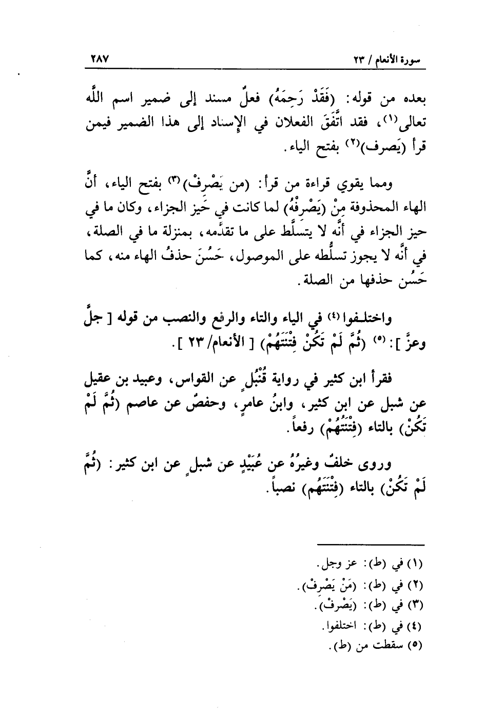 ومما يقوي قراءة من قرأ: من يصرف «3» بفتح الياء، أنّ الهاء المحذوفة من يصرفه لما كانت في حيز الجزاء، وكان ما في حيز الجزاء في أنّه لا يتسلّط على ما تقدّمه، بمنزلة ما في الصلة، في أنّه لا يجوز تسلّطه على الموصول، حسن حذف الهاء منه، كما حسن حذفها من الصلة.