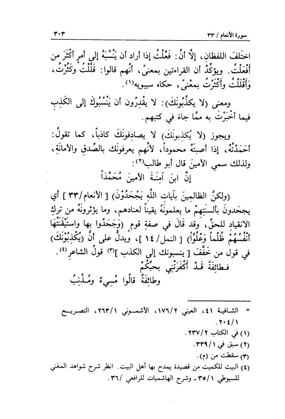 إنّ ابن آمنة الأمين محمّدا ولكن الظالمين بآيات الله يجحدون [الأنعام/ 33] أي يجحدون بألسنتهم ما يعلمونه يقينا لعنادهم، وما يؤثرونه من ترك الانقياد للحقّ، وقد قال في صفة قوم وجحدوا بها واستيقنتها أنفسهم ظلما وعلوا [النمل/ 14]، ويدلّ على أنّ يكذبونك في قول من خفّف [ينسبونك إلى الكذب] «3» قول الشاعر «4».