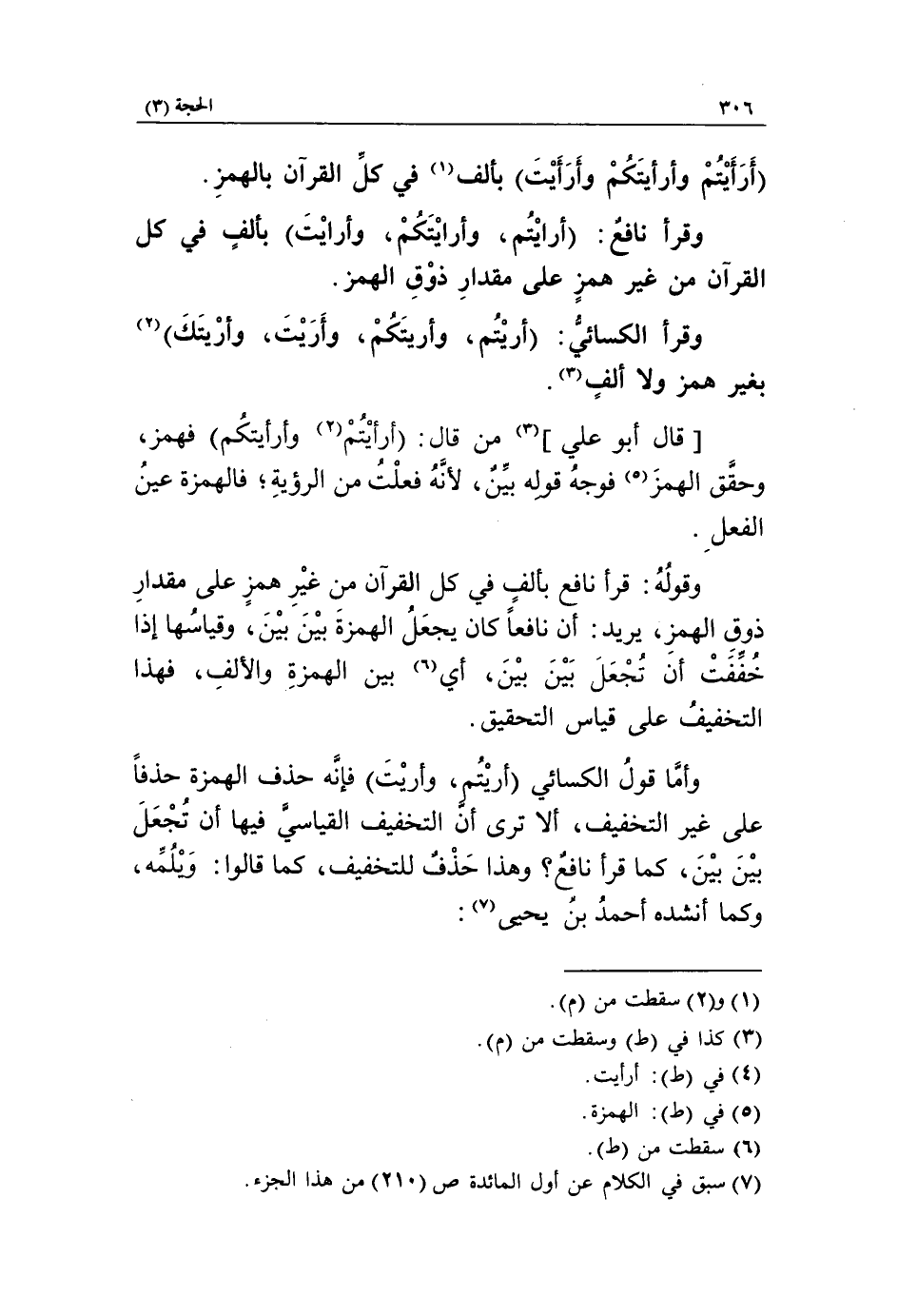 وأمّا قول الكسائي أريتم، وأريت فإنّه حذف الهمزة حذفا على غير التخفيف، ألا ترى أنّ التخفيف القياسيّ فيها أن تجعل بين بين، كما قرأ نافع؟ وهذا حذف للتخفيف، كما قالوا: ويلمّه، وكما أنشده أحمد بن يحيى «8»: