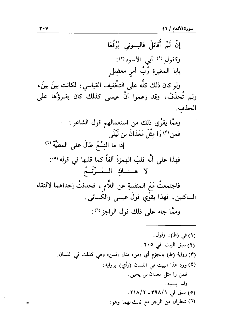 يا با المغيرة ربّ أمر معضل ولو كان ذلك كلّه على التخفيف القياسي، لكانت بين بين، ولم تحذف، وقد زعموا أنّ عيسى كذلك كان يقرؤها على الحذف.