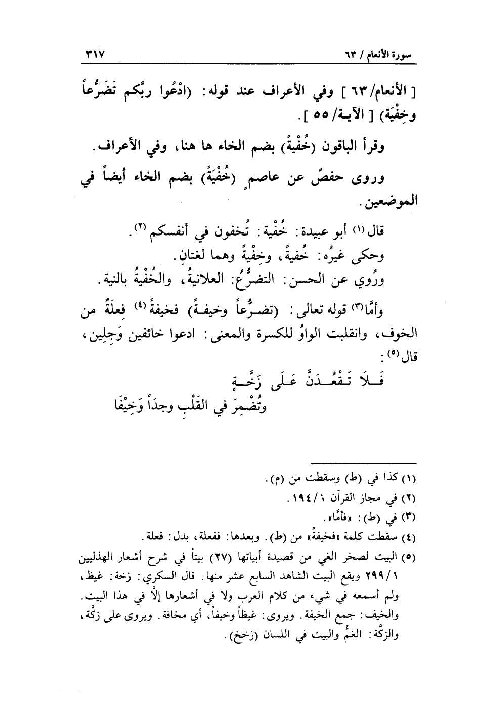 (5) البيت لصخر الغي من قصيدة أبياتها (27) بيتا في شرح أشعار الهذليين 1/ 299 ويقع البيت الشاهد السابع عشر منها. قال السكري: زخة: غيظ، ولم أسمعه في شيء من كلام العرب ولا في أشعارها إلّا في هذا البيت.