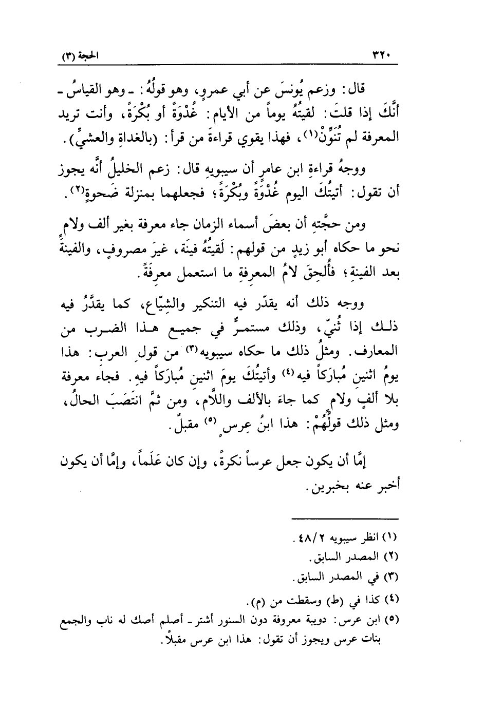 قال: وزعم يونس عن أبي عمرو، وهو قوله:- وهو القياس- أنّك إذا قلت: لقيته يوما من الأيام: غدوة أو بكرة، وأنت تريد المعرفة لم تنوّن «1»، فهذا يقوي قراءة من قرأ: بالغداة والعشي*.