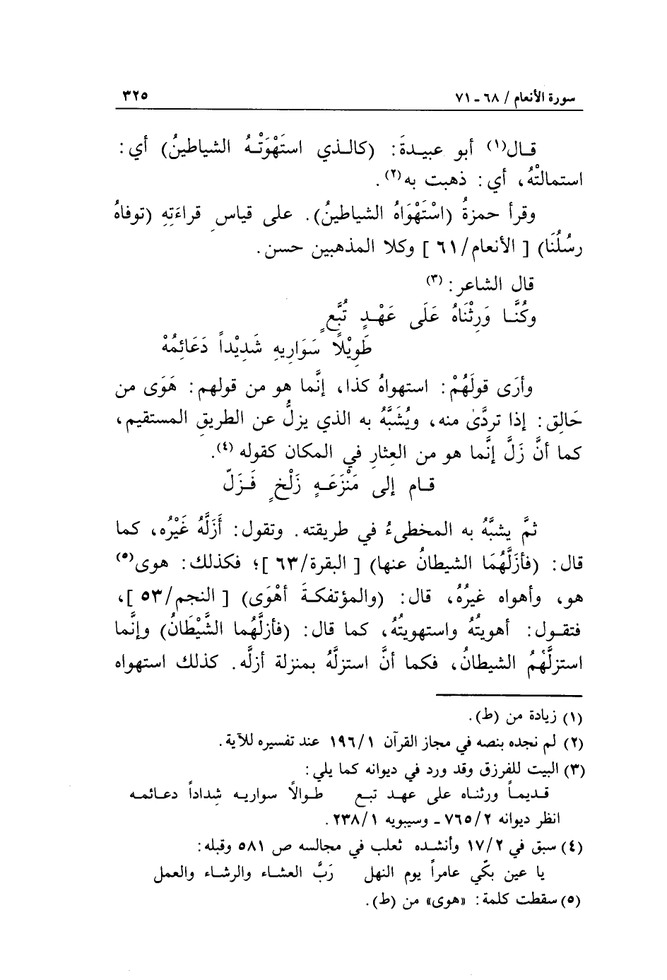 وأرى قولهم: استهواه كذا، إنّما هو من قولهم: هوى من حالق: إذا تردّى منه، ويشبّه به الذي يزلّ عن الطريق المستقيم، كما أنّ زلّ إنّما هو من العثار في المكان كقوله «4».