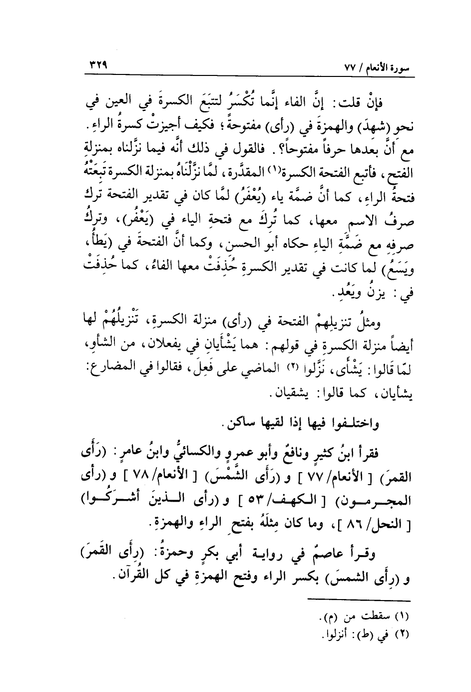 فقرأ ابن كثير ونافع وأبو عمرو والكسائيّ وابن عامر: رأى القمر [الأنعام/ 77] ورأى الشمس [الأنعام/ 78] ورأى المجرمون [الكهف/ 53] ورأى الذين أشركوا [النحل/ 86]، وما كان مثله بفتح الراء والهمزة.