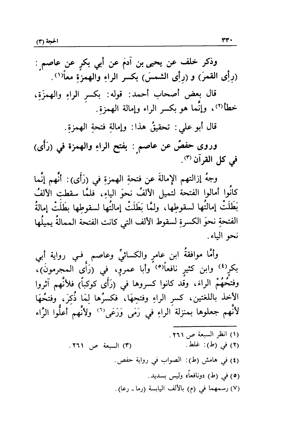وأمّا موافقة ابن عامر والكسائيّ وعاصم في رواية أبي بكر «4» وابن كثير نافعا «5» وأبا عمرو، في رأى المجرمون، وفتحهم الراء، وقد كانوا كسروها في رأى كوكبا فلأنّهم آثروا الأخذ باللغتين، كسر الراء وفتحها، فكسرها لما ذكر، وفتحها لأنّهم جعلوها بمنزلة الراء في رمى ورعى «6» ولأنّهم أعلّوا الرّاء