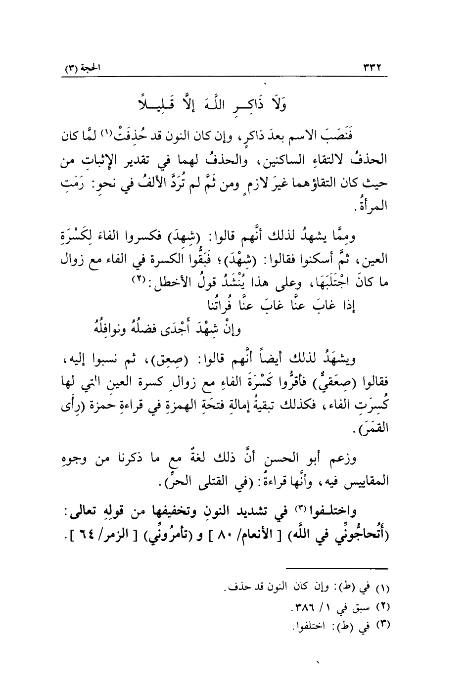 وممّا يشهد لذلك أنّهم قالوا: شهد* فكسروا الفاء لكسرة العين، ثمّ أسكنوا فقالوا: شهد*، فبقّوا الكسرة في الفاء مع زوال ما كان اجتلبها، وعلى هذا ينشد قول الأخطل: «2»