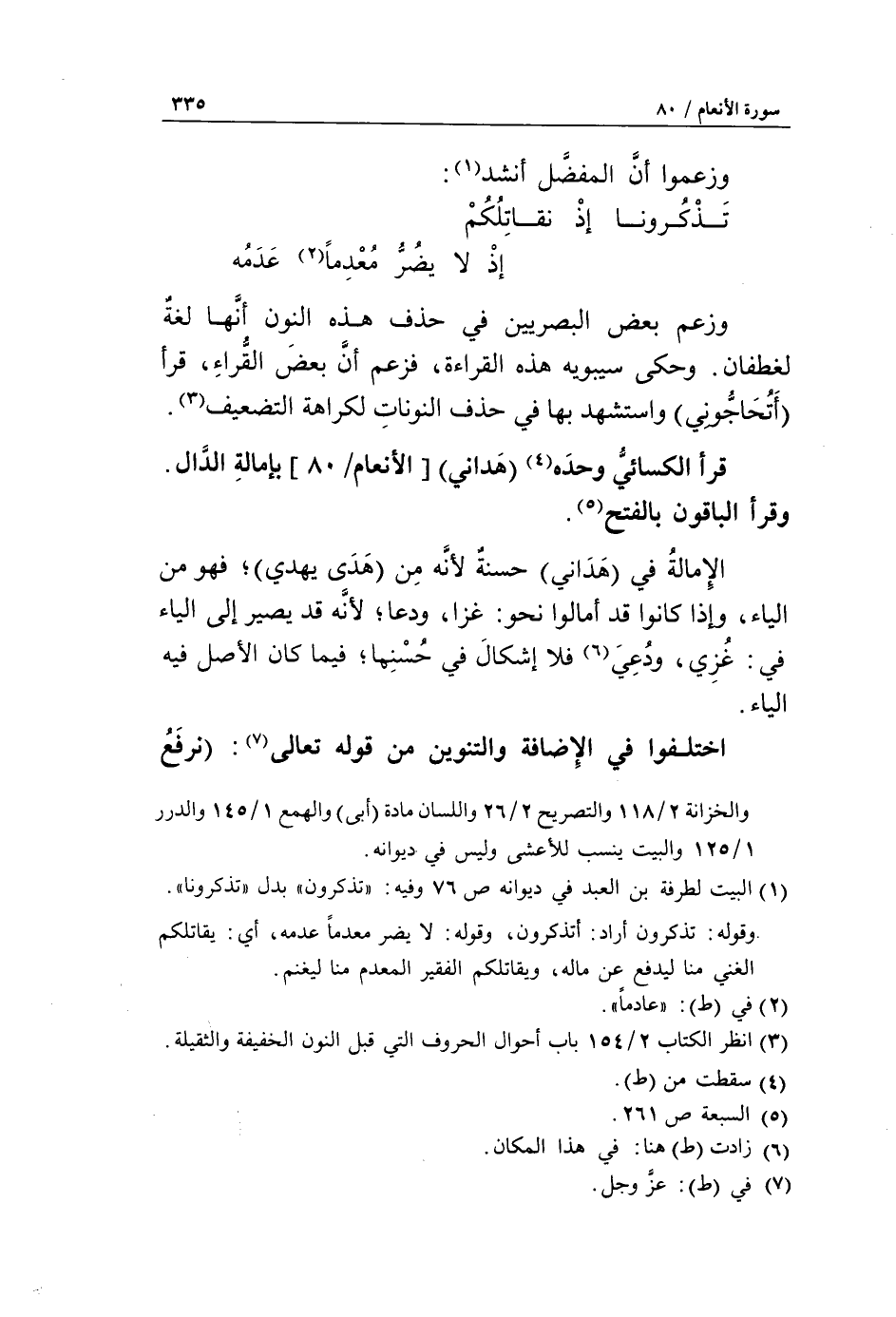 «2» عدمه وزعم بعض البصريين في حذف هذه النون أنّها لغة لغطفان. وحكى سيبويه هذه القراءة، فزعم أنّ بعض القراء، قرأ أتحاجوني واستشهد بها في حذف النونات لكراهة التضعيف «3».