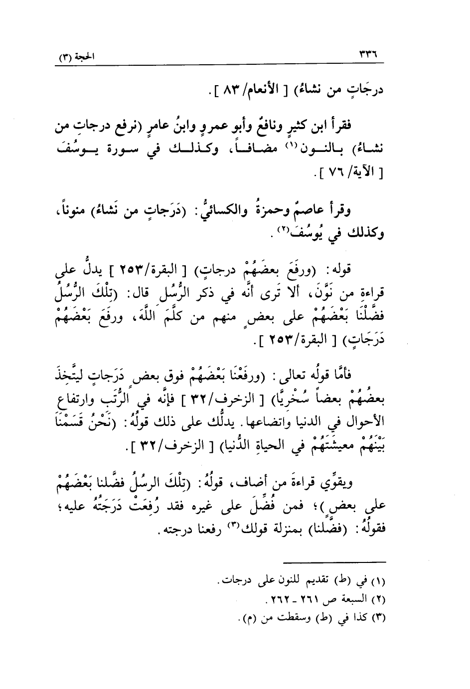 فقرأ ابن كثير ونافع وأبو عمرو وابن عامر نرفع درجات من نشاء بالنون «1» مضافا، وكذلك في سورة يوسف الآية/ 76].