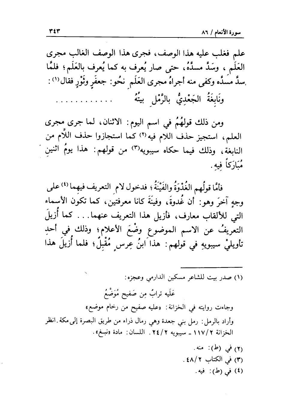 ومن ذلك قولهم في اسم اليوم: الاثنان، لما جرى مجرى العلم، استجيز حذف اللام فيه «2» كما استجازوا حذف اللّام من النابغة، وذلك فيما حكاه سيبويه «3» من قولهم: هذا يوم اثنين مباركا فيه.