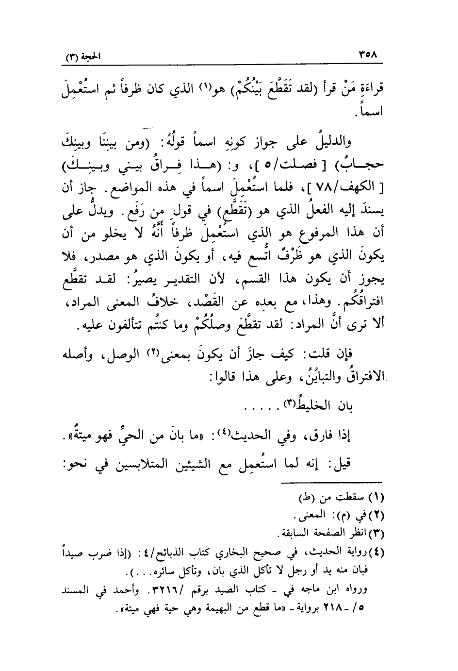 (4) رواية الحديث، في صحيح البخاري كتاب الذبائح/ 4: (إذا ضرب صيدا فبان منه يد أو رجل لا تأكل الذي بان، وتأكل سائره ... ).