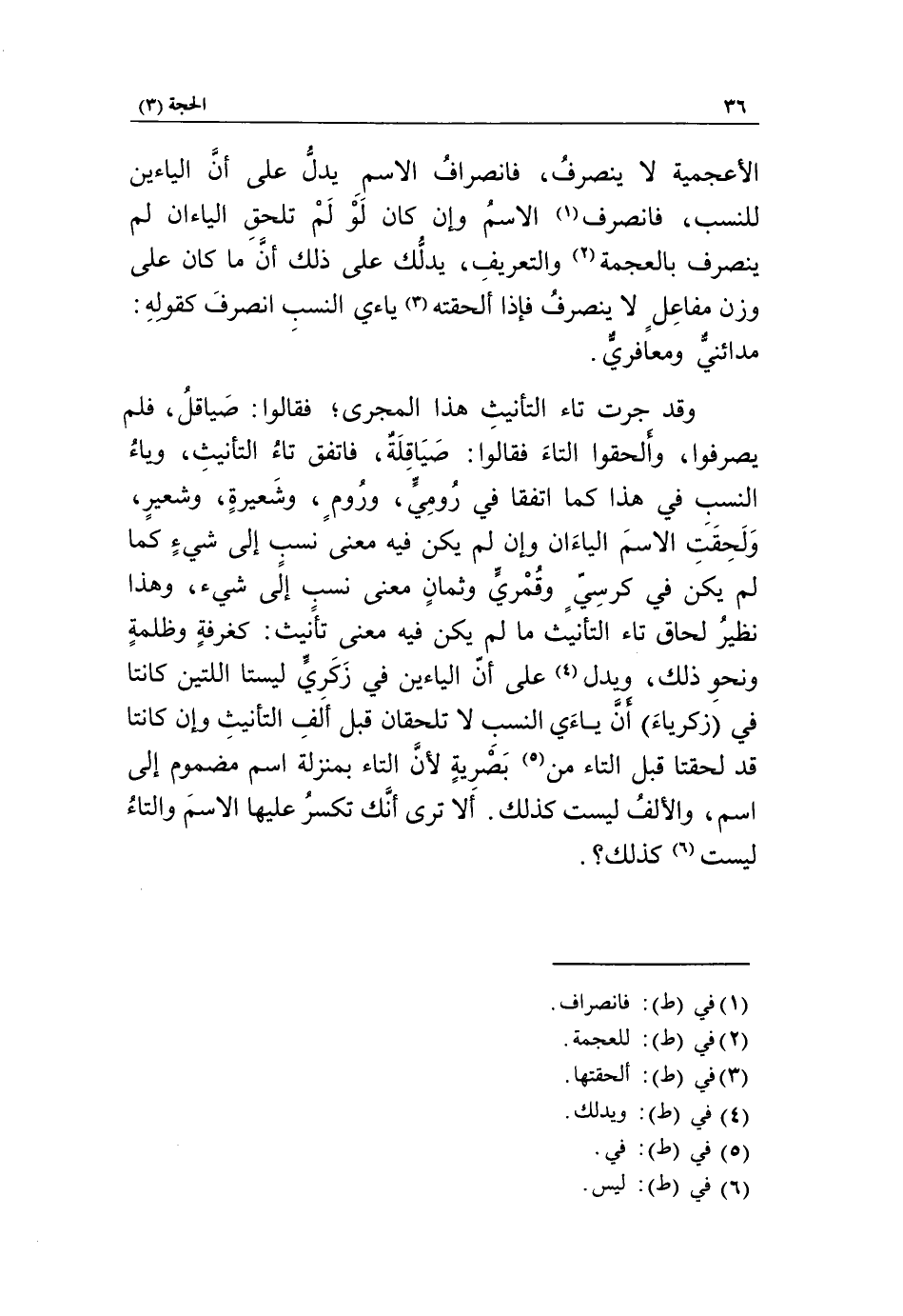 وقد جرت تاء التأنيث هذا المجرى، فقالوا: صياقل، فلم يصرفوا، وألحقوا التاء فقالوا: صياقلة، فاتفق تاء التأنيث، وياء النسب في هذا كما اتفقا في روميّ، وروم، وشعيرة، وشعير، ولحقت الاسم الياءان وإن لم يكن فيه معنى نسب إلى شيء كما لم يكن في كرسيّ وقمريّ وثمان معنى نسب إلى شيء، وهذا نظير لحاق تاء التأنيث ما لم يكن فيه معنى تأنيث: كغرفة وظلمة ونحو ذلك، ويدل «4» على أنّ الياءين في زكريّ ليستا اللتين كانتا في (زكرياء) أنّ ياءي النسب لا تلحقان قبل ألف التأنيث وإن كانتا قد لحقتا قبل التاء من «5» بصرية لأنّ التاء بمنزلة اسم مضموم إلى اسم، والألف ليست كذلك. ألا ترى أنّك تكسر عليها الاسم والتاء ليست «6» كذلك؟.
