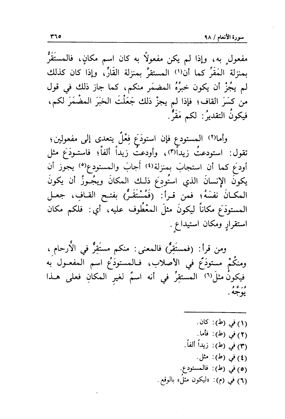 وأما «2» المستودع فإن استودع فعل يتعدى إلى مفعولين، تقول: استودعت زيدا «3»، وأودعت زيدا ألفا، فاستودع مثل أودع كما أن استجاب بمنزلة «4» أجاب والمستودع «5» يجوز أن يكون الإنسان الذي استودع ذلك المكان ويجوز أن يكون المكان نفسه، فمن قرأ: فمستقر بفتح القاف، جعل المستودع مكانا ليكون مثل المعطوف عليه، أي: فلكم مكان استقرار ومكان استيداع.