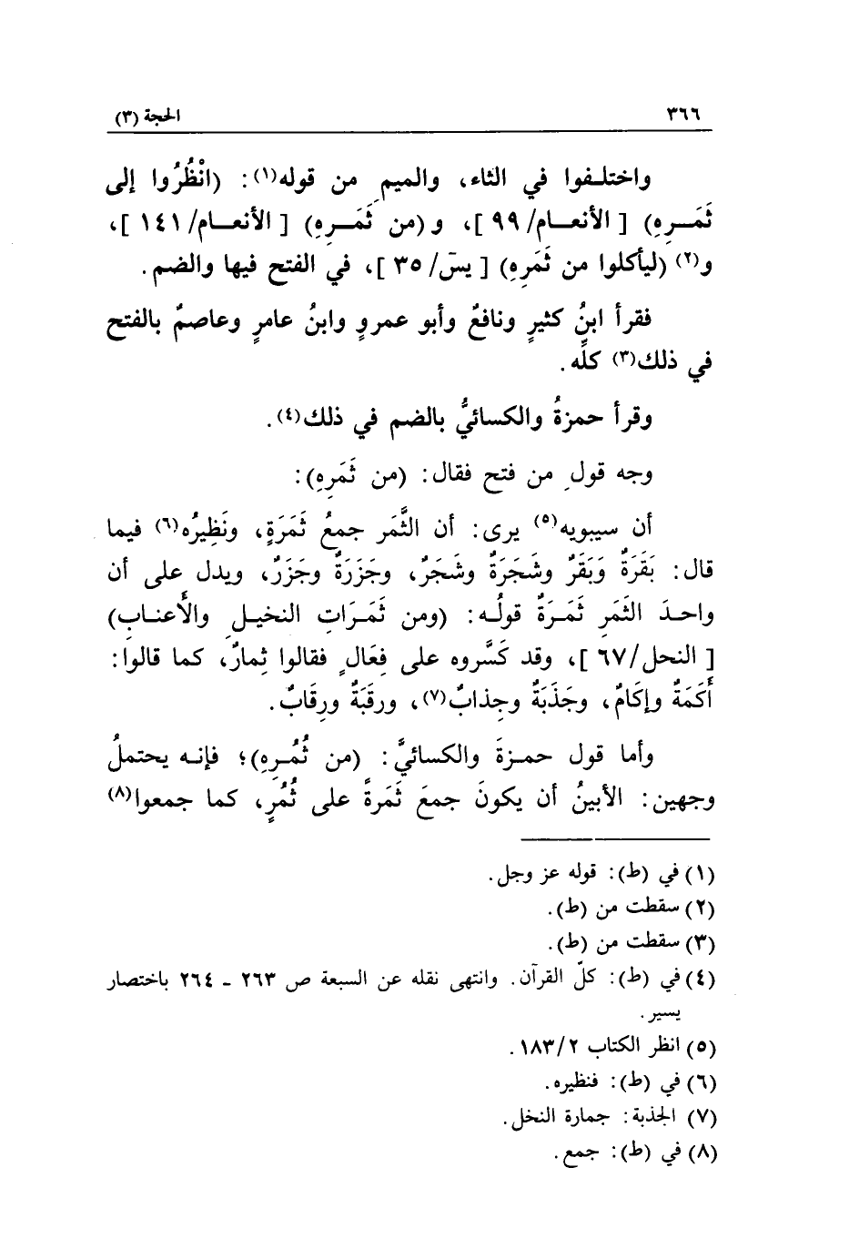 وأما قول حمزة والكسائيّ: من ثمره*، فإنه يحتمل وجهين: الأبين أن يكون جمع ثمرة على ثمر، كما جمعوا «8»