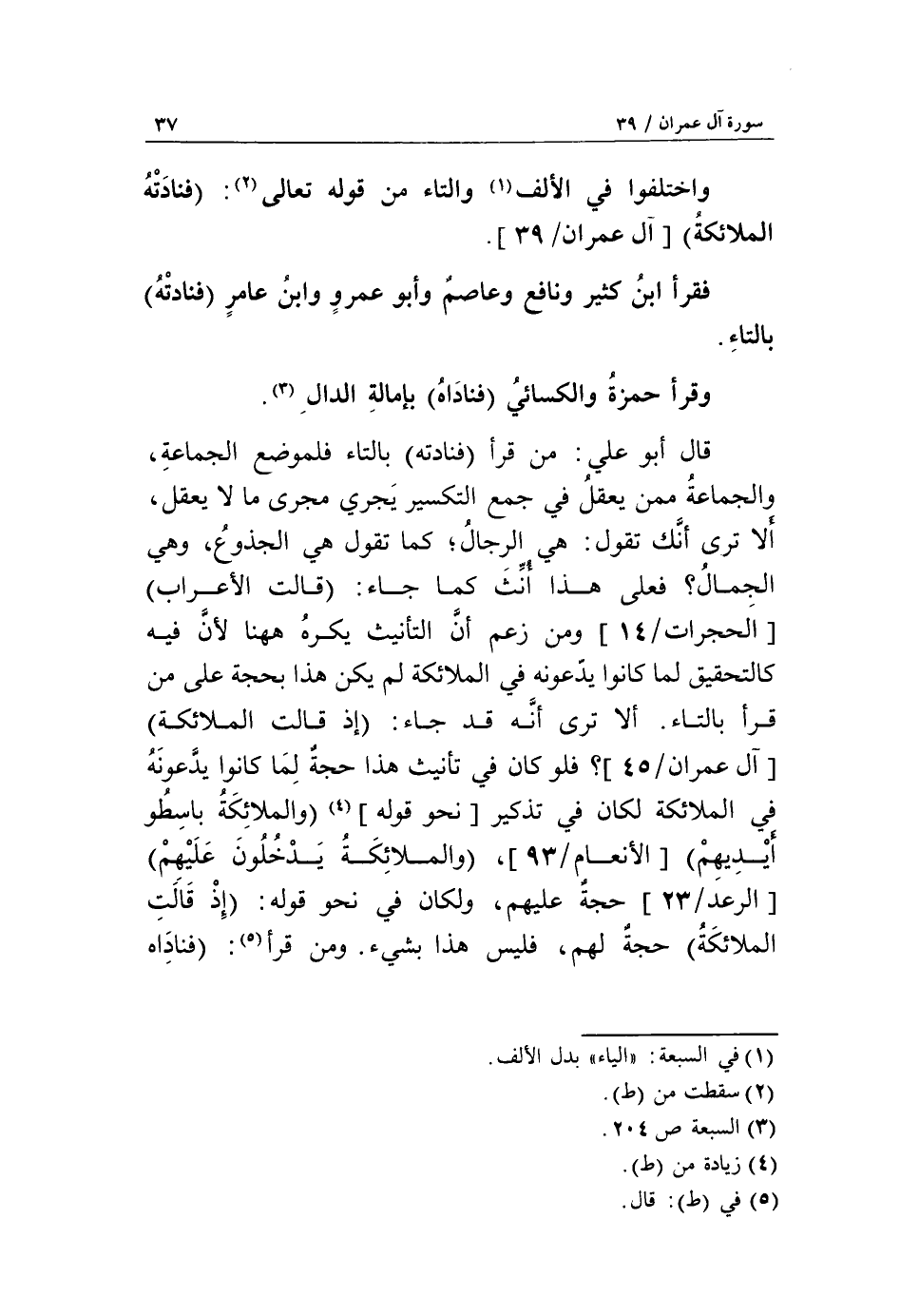 واختلفوا في الألف «1» والتاء من قوله تعالى «2»: فنادته الملائكة [آل عمران/ 39].
