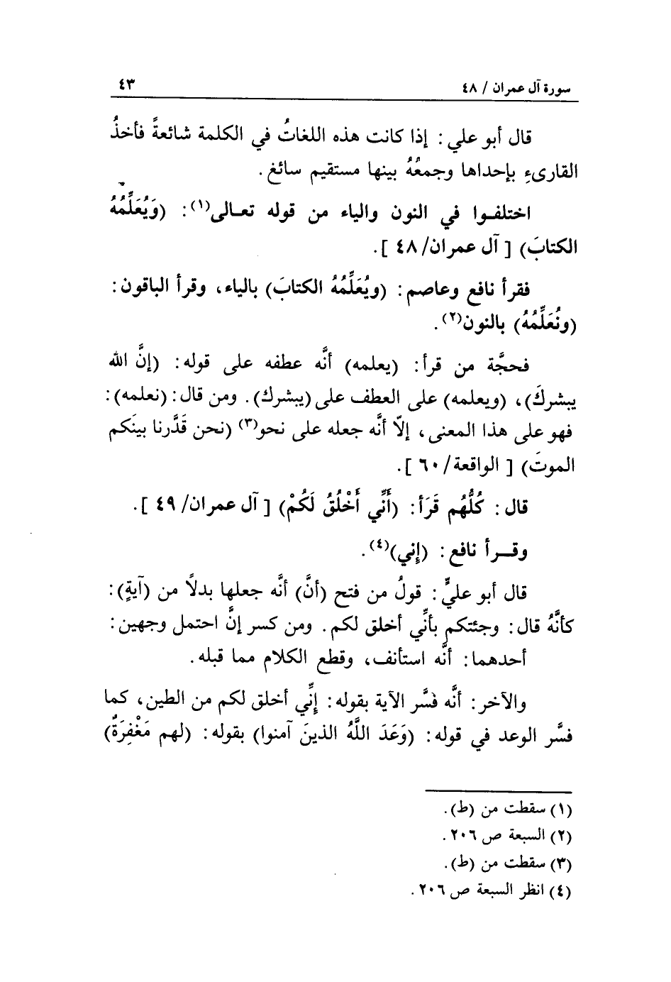 اختلفوا في النون والياء من قوله تعالى «1»: ويعلمه الكتاب [آل عمران/ 48].
