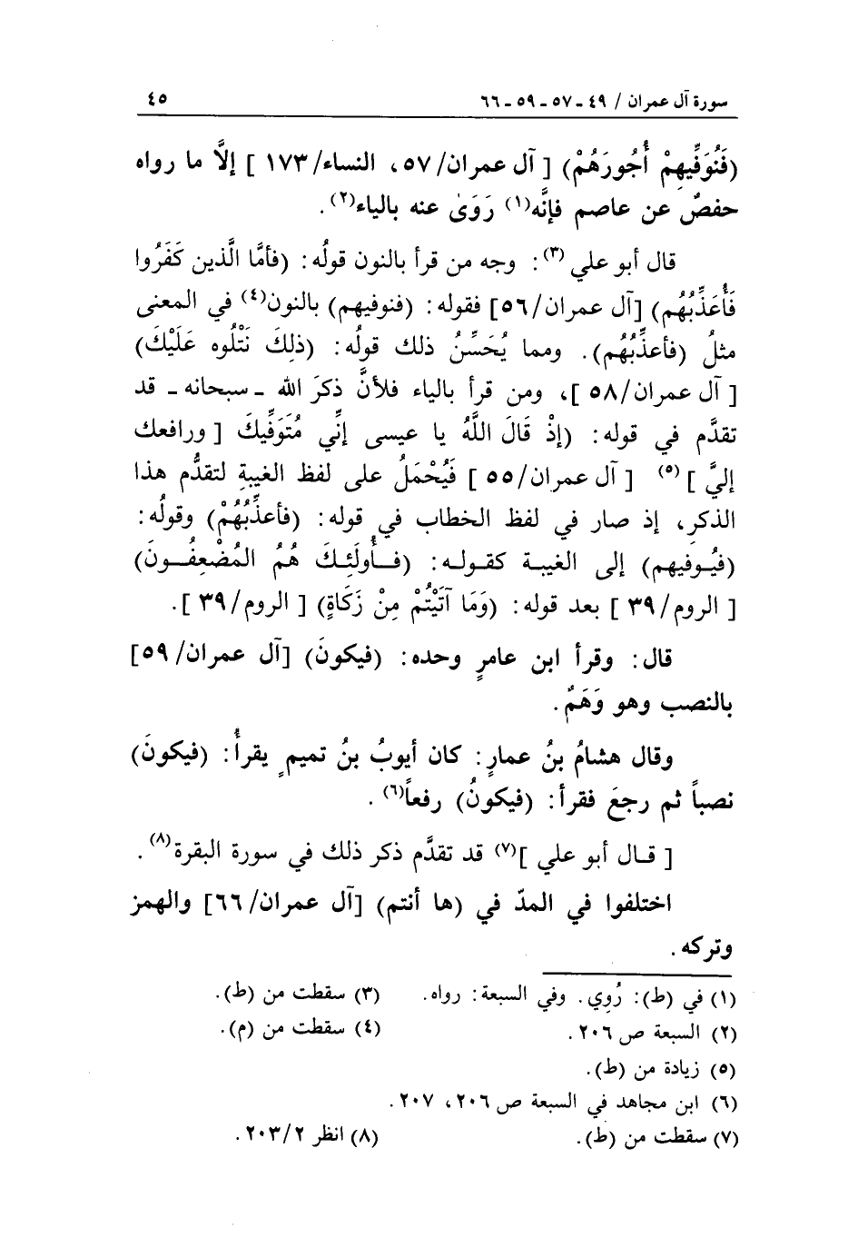 قال أبو علي «3»: وجه من قرأ بالنون قوله: فأما الذين كفروا فأعذبهم [آل عمران/ 56] فقوله: فنوفيهم بالنون «4» في المعنى مثل فأعذبهم. ومما يحسّن ذلك قوله: ذلك نتلوه عليك [آل عمران/ 58]، ومن قرأ بالياء فلأنّ ذكر الله- سبحانه- قد تقدّم في قوله: إذ قال الله يا عيسى إني متوفيك [ورافعك إلي] «5» [آل عمران/ 55] فيحمل على لفظ الغيبة لتقدّم هذا الذكر، إذ صار في لفظ الخطاب في قوله: فأعذبهم وقوله: