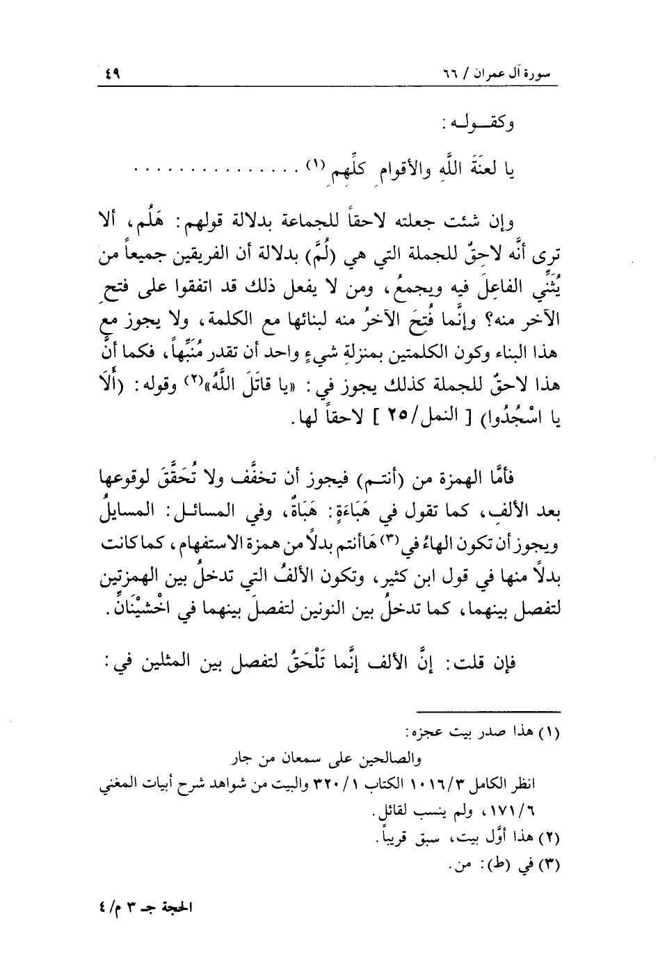 وإن شئت جعلته لاحقا للجماعة بدلالة قولهم: هلم، ألا ترى أنّه لاحق للجملة التي هي (لمّ) بدلالة أن الفريقين جميعا من يثنّي الفاعل فيه ويجمع، ومن لا يفعل ذلك قد اتفقوا على فتح الآخر منه؟ وإنّما فتح الآخر منه لبنائها مع الكلمة، ولا يجوز مع هذا البناء وكون الكلمتين بمنزلة شيء واحد أن تقدر منبّها، فكما أنّ هذا لاحق للجملة كذلك يجوز في: «يا قاتل الله» «2» وقوله: ألا يا اسجدوا [النمل/ 25] لاحقا لها.