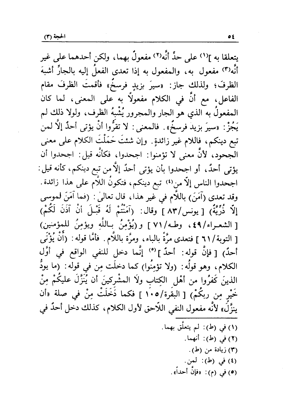 يتعلقا به] «1» على حدّ أنّه «2» مفعول بهما، ولكن أحدهما على غير أنّه «3» مفعول به، والمفعول به إذا تعدى الفعل إليه بالجارّ أشبه الظرف، ولذلك جاز: «سير بزيد فرسخ» فأقمت الظرف مقام الفاعل، مع أنّ في الكلام مفعولا به على المعنى، لما كان المفعول به الذي هو الجار والمجرور يشبه الظرف، ولولا ذلك لم يجز: «سير بزيد فرسخ». فالمعنى: لا تقرّوا أن يؤتى أحد إلّا لمن تبع دينكم، فاللام غير زائدة. وإن شئت حملت الكلام على معنى الجحود، لأنّ معنى لا تؤمنوا: اجحدوا، فكأنّه قيل: اجحدوا أن يؤتى أحد، أو اجحدوا بأن يؤتى أحد إلّا من تبع دينكم، كأنه قيل: