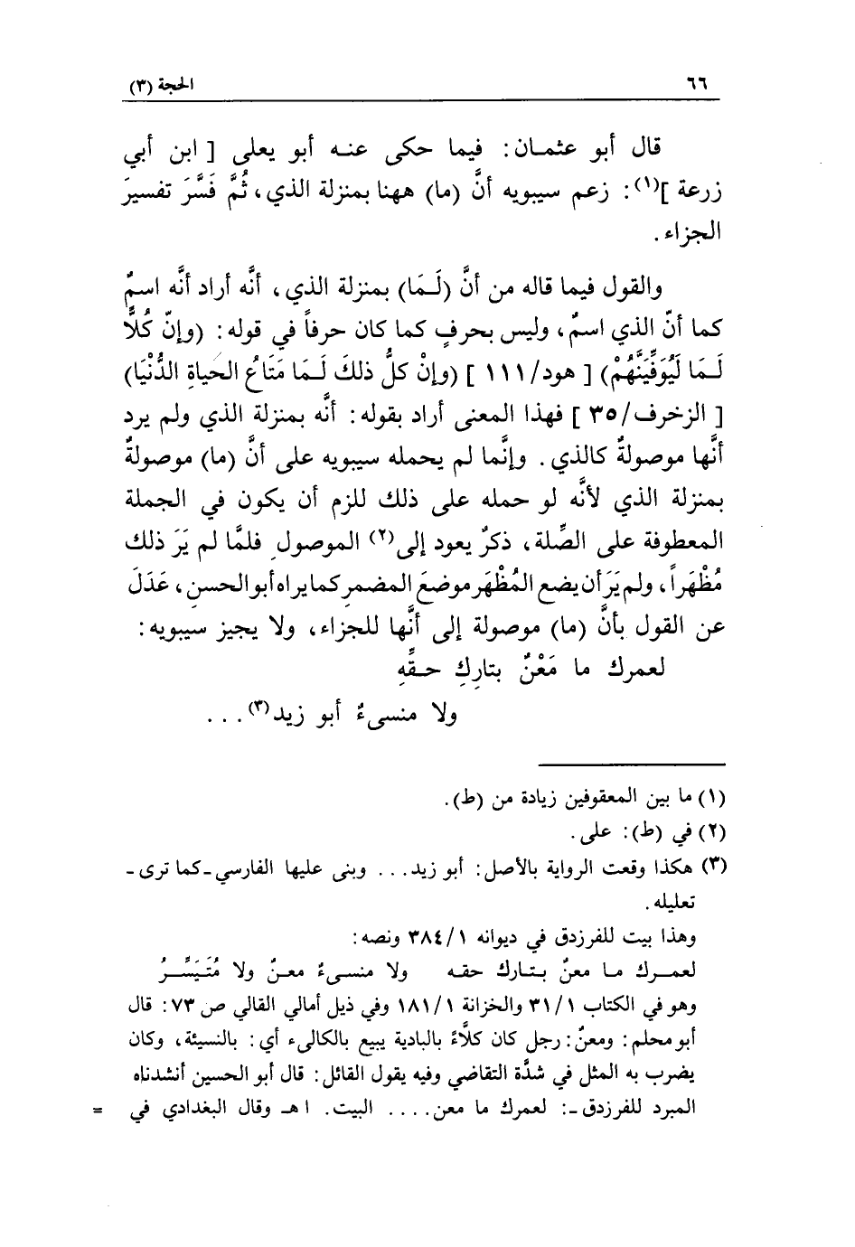 [الزخرف/ 35] فهذا المعنى أراد بقوله: أنّه بمنزلة الذي ولم يرد أنّها موصولة كالذي. وإنّما لم يحمله سيبويه على أنّ (ما) موصولة بمنزلة الذي لأنّه لو حمله على ذلك للزم أن يكون في الجملة المعطوفة على الصّلة، ذكر يعود إلى «2» الموصول فلمّا لم ير ذلك مظهرا، ولم ير أن يضع المظهر موضع المضمر كما يراه أبو الحسن، عدل عن القول بأنّ (ما) موصولة إلى أنّها للجزاء، ولا يجيز سيبويه: