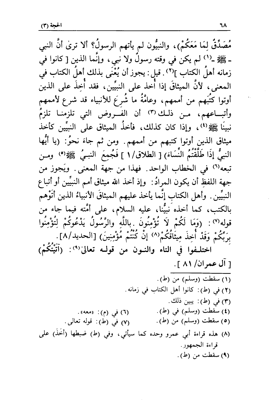 ، والنبيّون لم يأتهم الرسول؟ ألا ترى أنّ النبي- صلى الله عليه وسلم- «1» لم يكن في وقته رسول ولا نبي، وإنّما الذين [كانوا في زمانه أهل الكتاب] «2». قيل: يجوز أن يعنى بذلك أهل الكتاب في المعنى، لأنّ الميثاق إذا أخذ على النبيّين، فقد أخذ على الذين أوتوا كتبهم من أممهم، وعامّة ما شرع للأنبياء قد شرع لأممهم وأتباعهم، من ذلك «3» أن الفروض التي تلزمنا تلزم نبينا صلى الله عليه وسلم «4»، وإذا كان كذلك، فأخذ الميثاق على النبيّين كأخذ ميثاق الذين أوتوا كتبهم من أممهم. ومن ثم جاء نحو: يا أيها النبي إذا طلقتم النساء [الطلاق/ 1] فجمع النبي صلى الله عليه وسلم «5» ومن تبعه «6» في الخطاب الواحد. فهذا من جهة المعنى. ويجوز من جهة اللفظ أن يكون المراد: وإذ أخذ الله ميثاق أمم النبيّين أو أتباع النبيّين. وأهل الكتاب إنّما يأخذ عليهم الميثاق الأنبياء الذين أتوهم بالكتب، كما أخذه نبيّنا، عليه السلام، على أمّته فيما جاء من قوله «7»: وما لكم لا تؤمنون. بالله والرسول يدعوكم لتؤمنوا بربكم وقد أخذ ميثاقكم «8» إن كنتم مؤمنين [الحديد/ 8].
