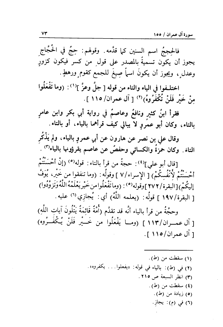 وحجّة من قرأ بالياء أنّه قد تقدّم أمة قائمة يتلون آيات الله [آل عمران/ 113] وما يفعلوا من خير فلن يكفروه [آل عمران/ 115].