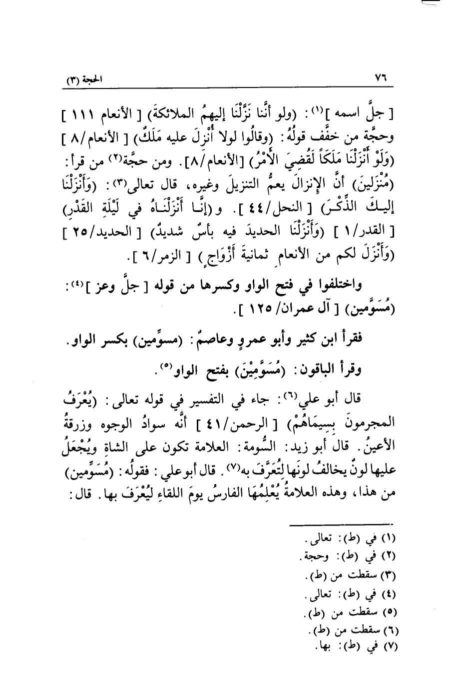 [جلّ اسمه] «1»: ولو أننا نزلنا إليهم الملائكة [الأنعام/ 111] وحجّة من خفّف قوله: وقالوا لولا أنزل عليه ملك [الأنعام/ 8] ولو أنزلنا ملكا لقضي الأمر [الأنعام/ 8]. ومن حجّة «2» من قرأ: