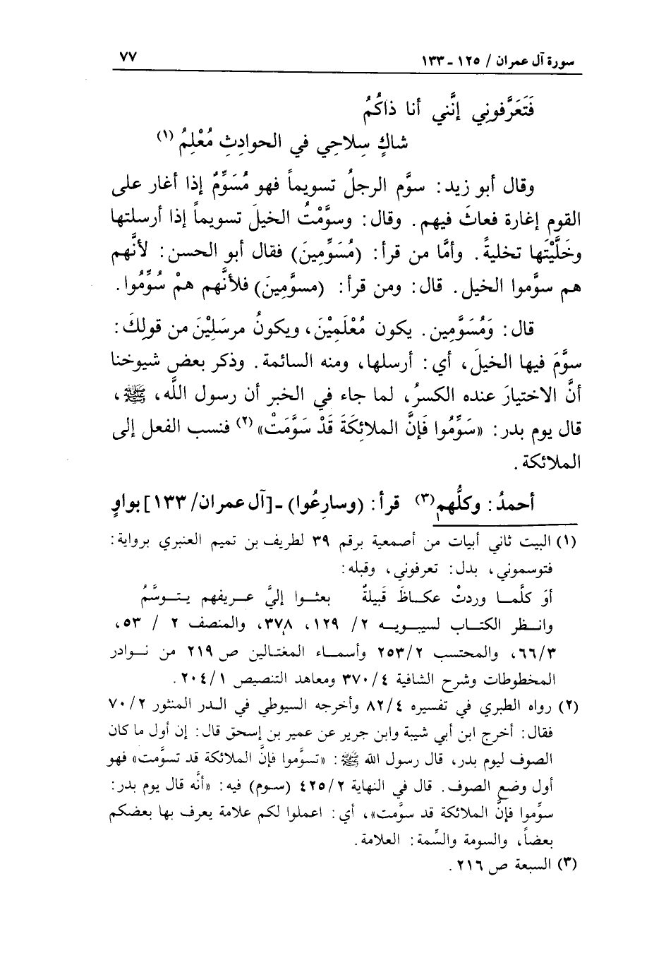 (2) رواه الطبري في تفسيره 4/ 82 وأخرجه السيوطي في الدر المنثور 2/ 70 فقال: أخرج ابن أبي شيبة وابن جرير عن عمير بن إسحاق قال: إن أول ما كان الصوف ليوم بدر، قال رسول الله صلى الله
