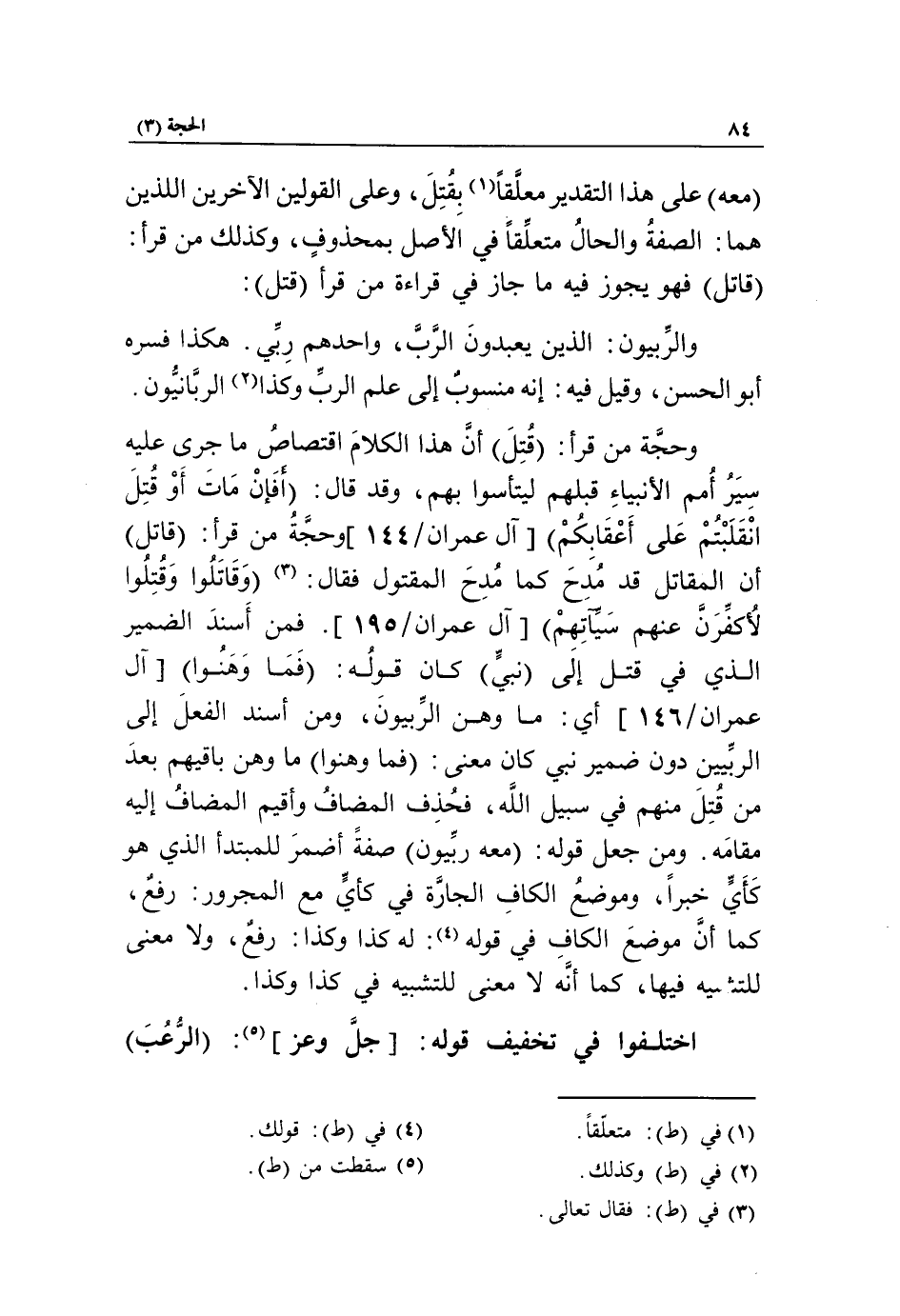وحجّة من قرأ: قتل* أنّ هذا الكلام اقتصاص ما جرى عليه سير أمم الأنبياء قبلهم ليتأسوا بهم، وقد قال: أفإن مات أو قتل انقلبتم على أعقابكم [آل عمران/ 144] وحجّة من قرأ: قاتل أن المقاتل قد مدح كما مدح المقتول فقال: «3» وقاتلوا وقتلوا لأكفرن عنهم سيئاتهم [آل عمران/ 195]. فمن أسند الضمير الذي في قتل إلى نبي كان قوله: فما وهنوا [آل عمران/ 146] أي: ما وهن الرّبيون، ومن أسند الفعل إلى الربّيين دون ضمير نبي كان معنى: فما وهنوا ما وهن باقيهم بعد من قتل منهم في سبيل الله، فحذف المضاف وأقيم المضاف إليه مقامه. ومن جعل قوله: معه ربيون صفة أضمر للمبتدإ الذي هو كأيّ خبرا، وموضع الكاف الجارّة في كأيّ مع المجرور: رفع، كما أنّ موضع الكاف في قوله «4»: له كذا وكذا: رفع، ولا معنى للتشبيه فيها، كما أنّه لا معنى للتشبيه في كذا وكذا.