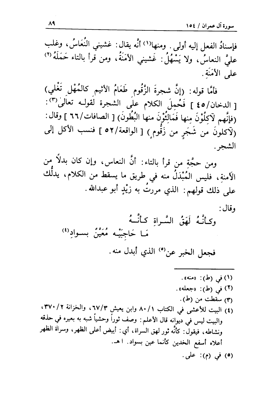 ومن حجّة من قرأ بالتاء: أنّ النعاس، وإن كان بدلا من الأمنة، فليس المبدل منه في طريق ما يسقط من الكلام، يدلّك على ذلك قولهم: الذي مررت به زيد أبو عبد الله.