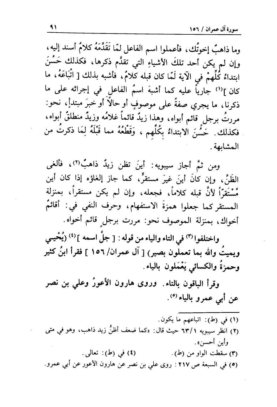 واختلفوا «3» في التاء والياء من قوله: [جلّ اسمه] «4» يحيى ويميت والله بما تعملون بصير [آل عمران/ 156] فقرأ ابن كثير وحمزة والكسائي يعملون بالياء.