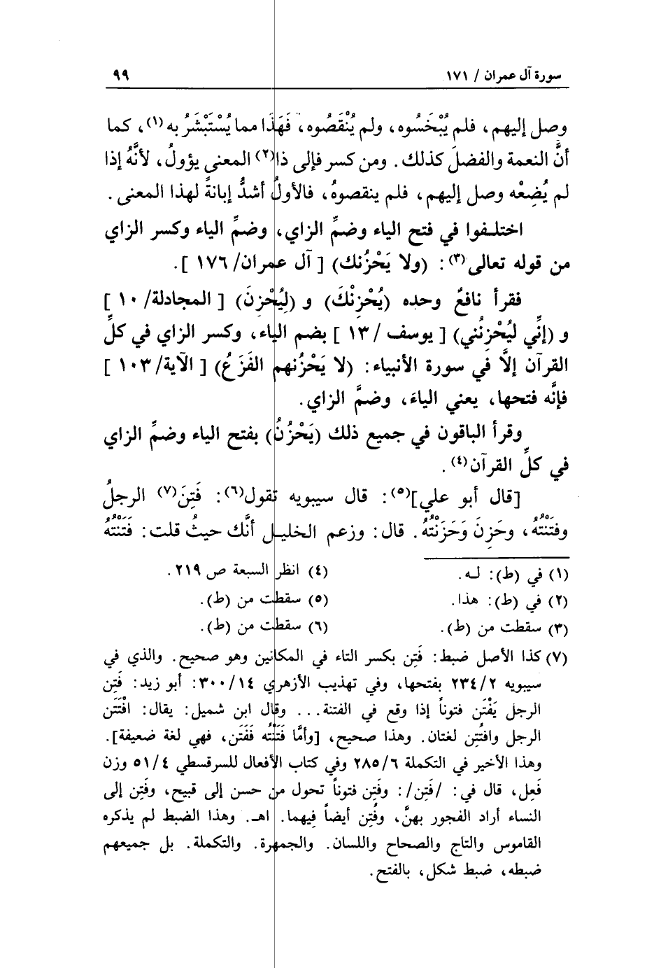 اختلفوا في فتح الياء وضمّ الزاي، وضمّ الياء وكسر الزاي من قوله تعالى «3»: ولا يحزنك [آل عمران/ 176].