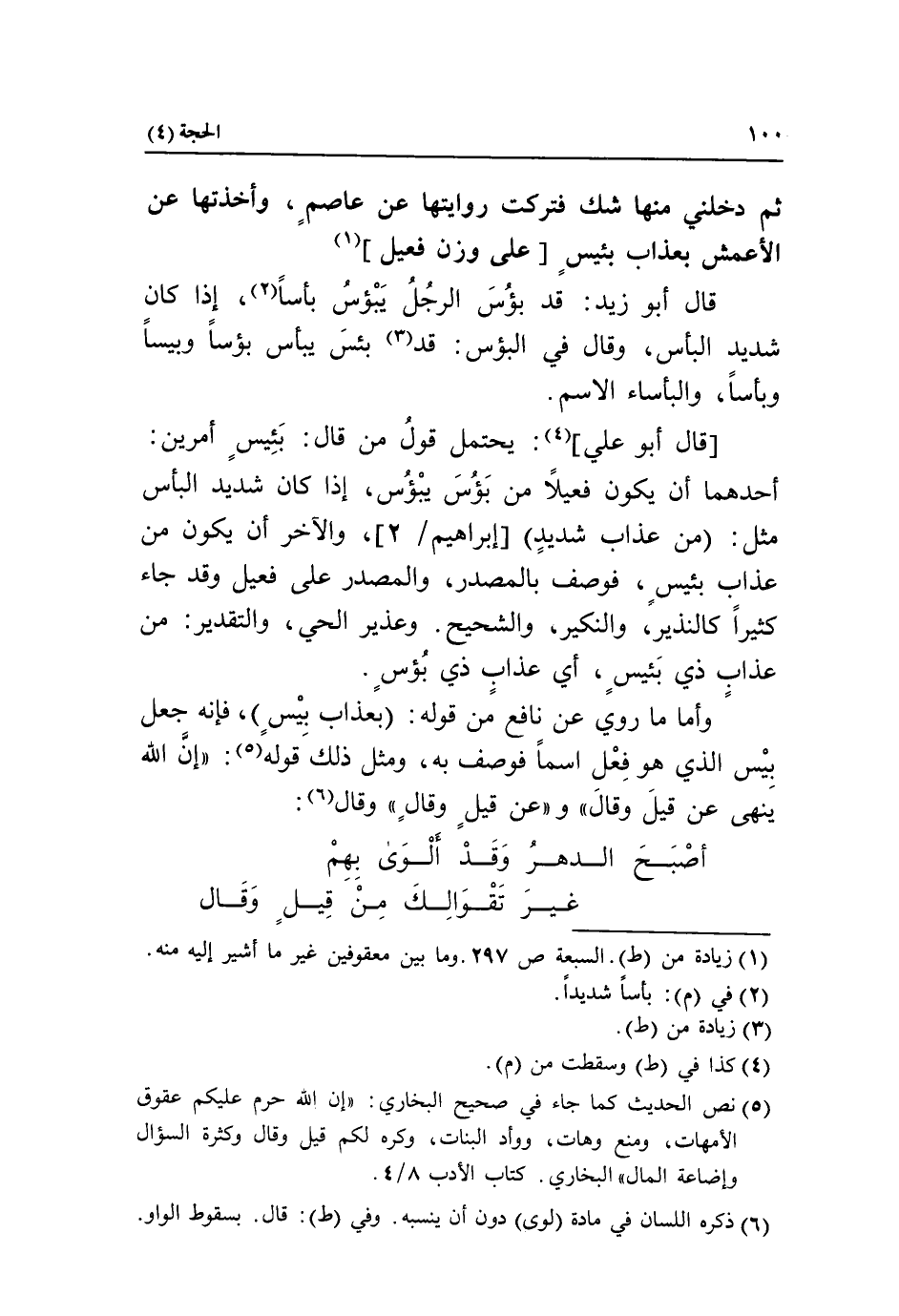 ثم دخلني منها شك فتركت روايتها عن عاصم، وأخذتها عن الأعمش بعذاب بئيس [على وزن فعيل] «1» قال أبو زيد: قد بؤس الرجل يبؤس بأسا «2»، إذا كان شديد البأس، وقال في البؤس: قد «3» بئس يبأس بؤسا وبيسا وبأسا، والبأساء الاسم.