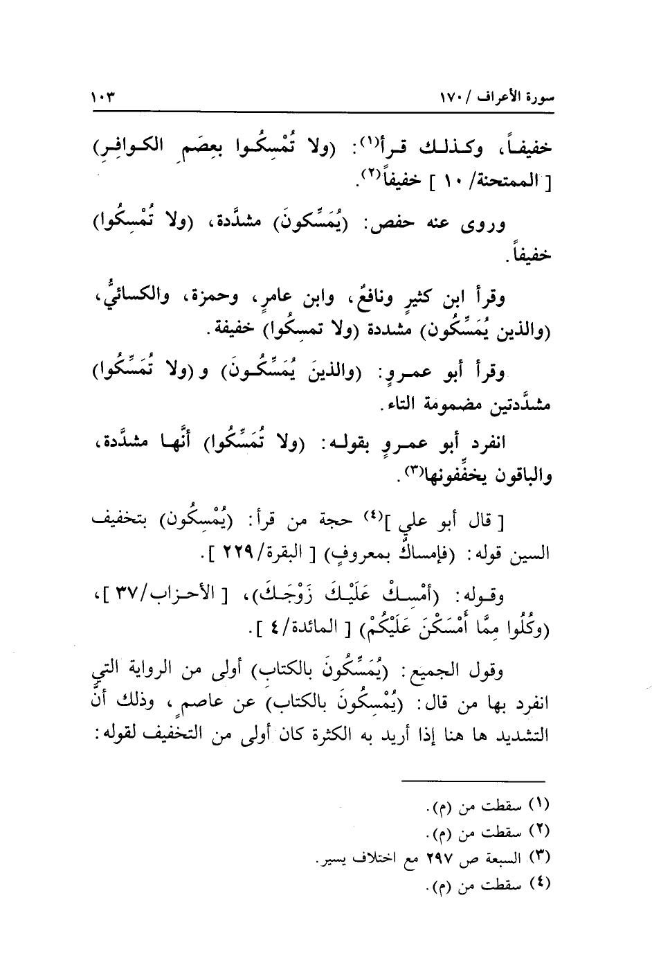 وقول الجميع: يمسكون بالكتاب أولى من الرواية التي انفرد بها من قال: يمسكون بالكتاب عن عاصم، وذلك أنّ التشديد هاهنا إذا أريد به الكثرة كان أولى من التخفيف لقوله: