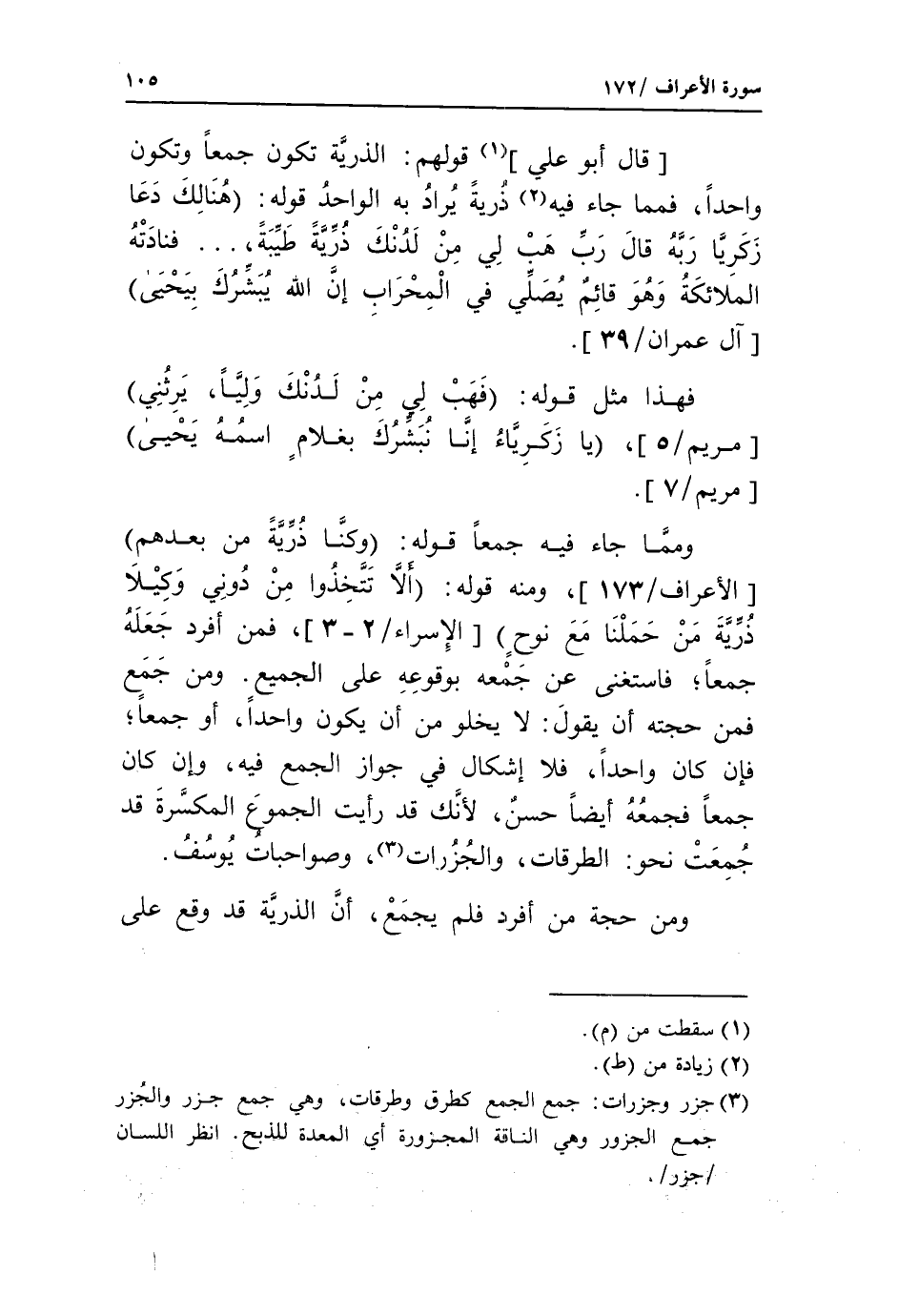 [قال أبو علي] «1» قولهم: الذريّة تكون جمعا وتكون واحدا، فمما جاء فيه «2» ذرية يراد به الواحد قوله: هنالك دعا زكريا ربه قال رب هب لى من لدنك ذرية طيبة، ... فنادته الملائكة وهو قائم يصلي في المحراب إن الله يبشرك بيحيى [آل عمران/ 39].