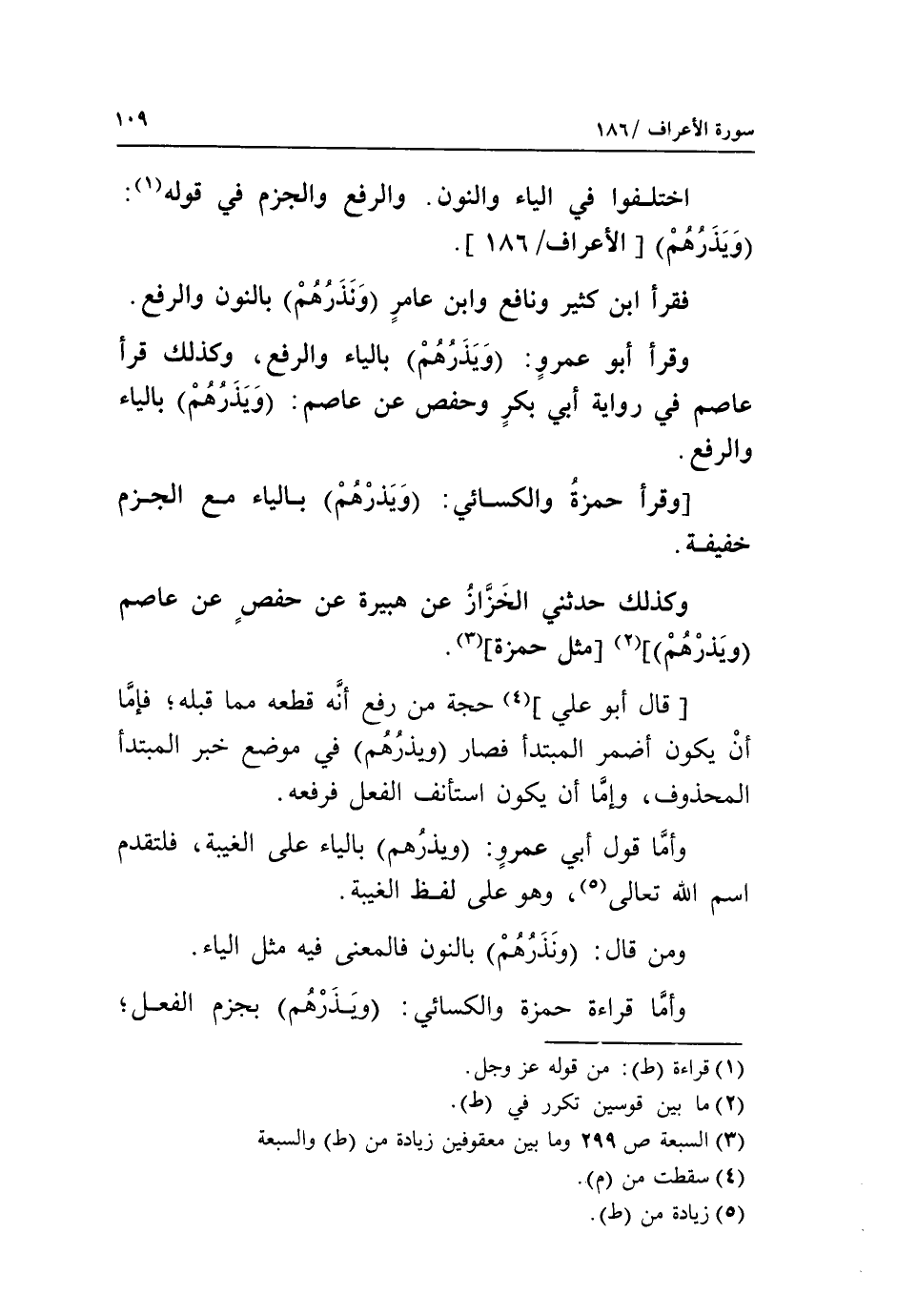 وأمّا قول أبي عمرو: ويذرهم بالياء على الغيبة، فلتقدم اسم الله تعالى «5»، وهو على لفظ الغيبة.