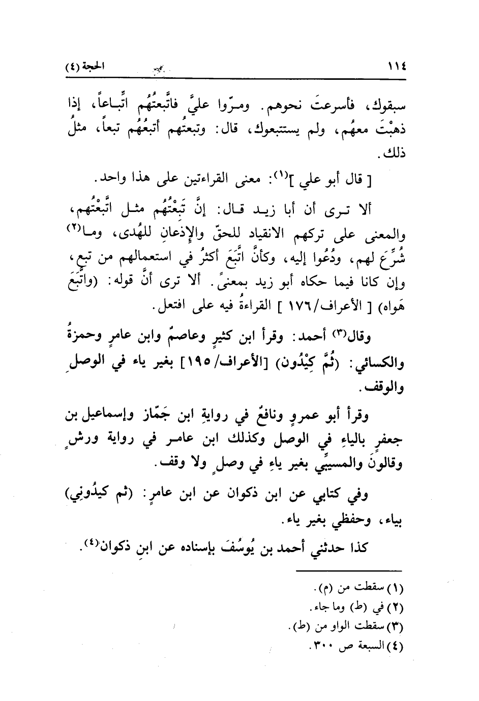 وقال «3» أحمد: وقرأ ابن كثير وعاصم وابن عامر وحمزة والكسائي: ثم كيدون [الأعراف/ 195] بغير ياء في الوصل والوقف.