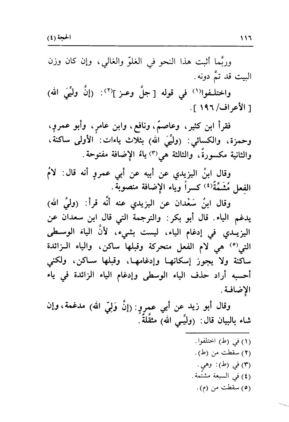 وقال أبو زيد عن أبي عمرو: إن ولي الله مدغمة، وإن شاء بالبيان قال: وليي الله مثقّلة.