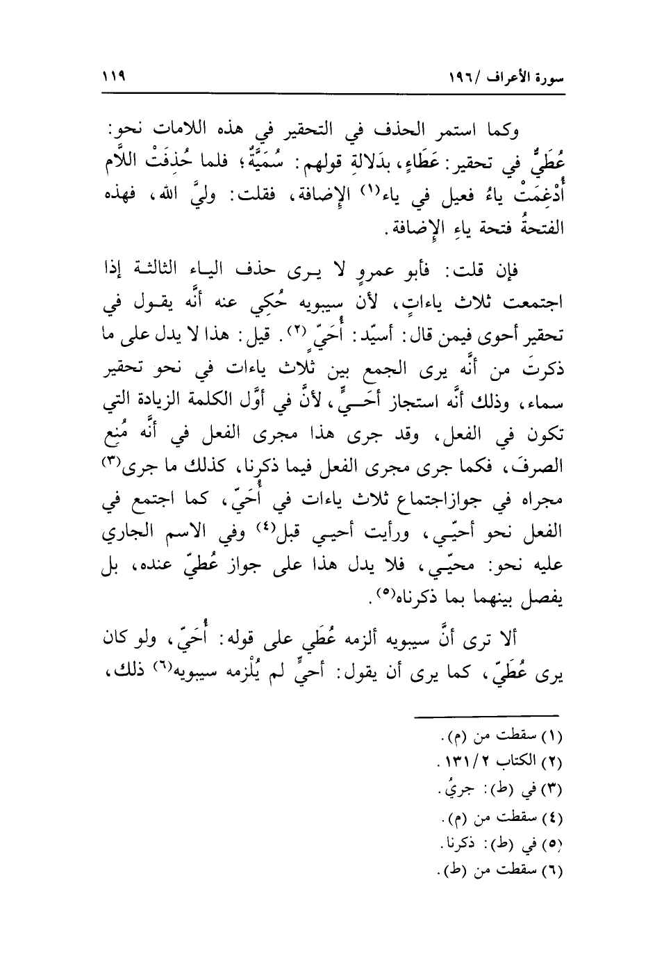 فإن قلت: فأبو عمرو لا يرى حذف الياء الثالثة إذا اجتمعت ثلاث ياءات، لأن سيبويه حكي عنه أنّه يقول في تحقير أحوى فيمن قال: أسيد: أحيّ «2». قيل: هذا لا يدل على ما ذكرت من أنّه يرى الجمع بين ثلاث ياءات في نحو تحقير سماء، وذلك أنّه استجاز أحيّ، لأنّ في أوّل الكلمة الزيادة التي تكون في الفعل، وقد جرى هذا مجرى الفعل في أنّه منع الصرف، فكما جرى مجرى الفعل فيما ذكرنا، كذلك ما جرى «3» مجراه في جواز اجتماع ثلاث ياءات في أحيّ، كما اجتمع في الفعل نحو أحيّي، ورأيت أحيي قبل «4» وفي الاسم الجاري عليه نحو: محيّي، فلا يدل هذا على جواز عطيّ عنده، بل يفصل بينهما بما ذكرناه «5».