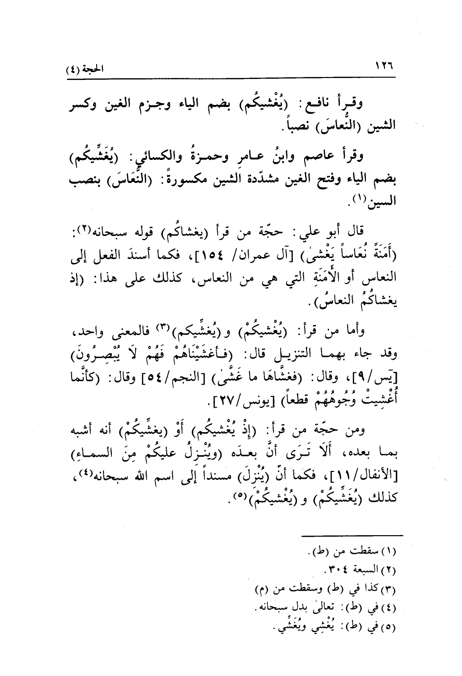 قال أبو علي: حجّة من قرأ يغشاكم قوله سبحانه «2»: