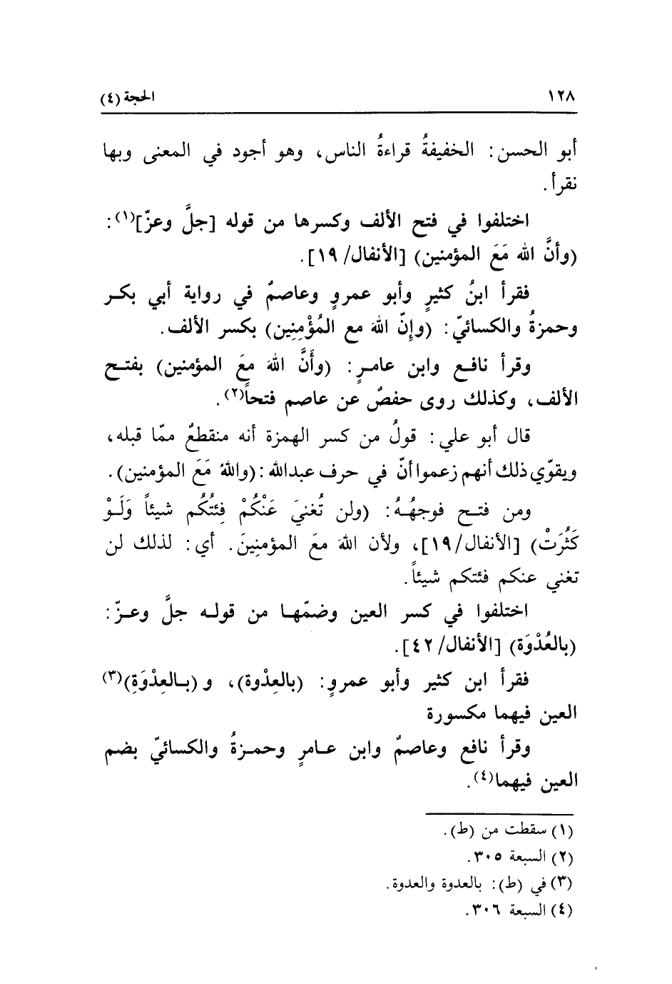 قال أبو علي: قول من كسر الهمزة أنه منقطع ممّا قبله، ويقوّي ذلك أنهم زعموا أنّ في حرف عبد الله: والله مع المؤمنين.