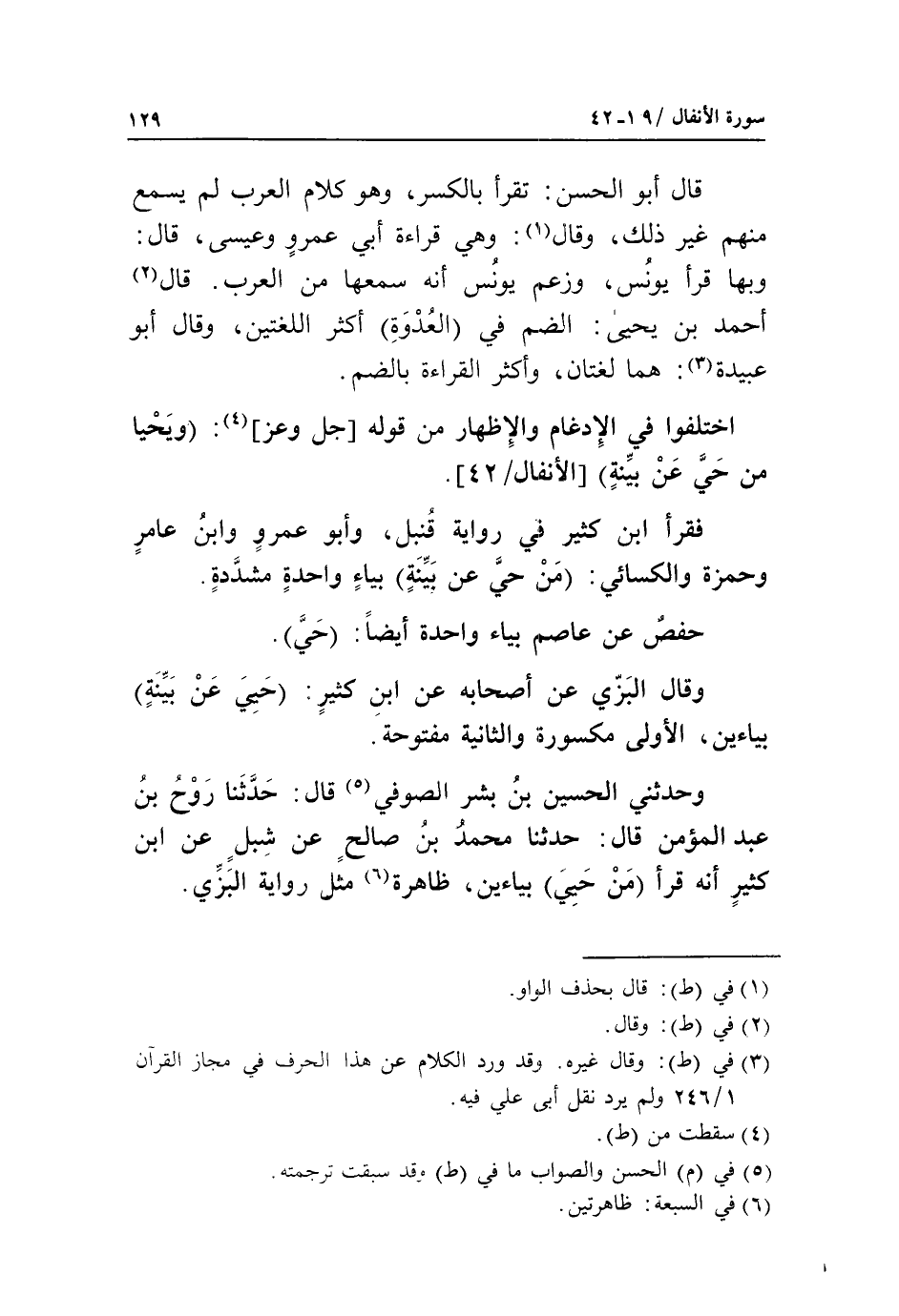 وحدثني الحسين بن بشر الصوفي «5» قال: حدّثنا روح بن عبد المؤمن قال: حدثنا محمد بن صالح عن شبل عن ابن كثير أنه قرأ من حيي بياءين، ظاهرة «6» مثل رواية البزّي.