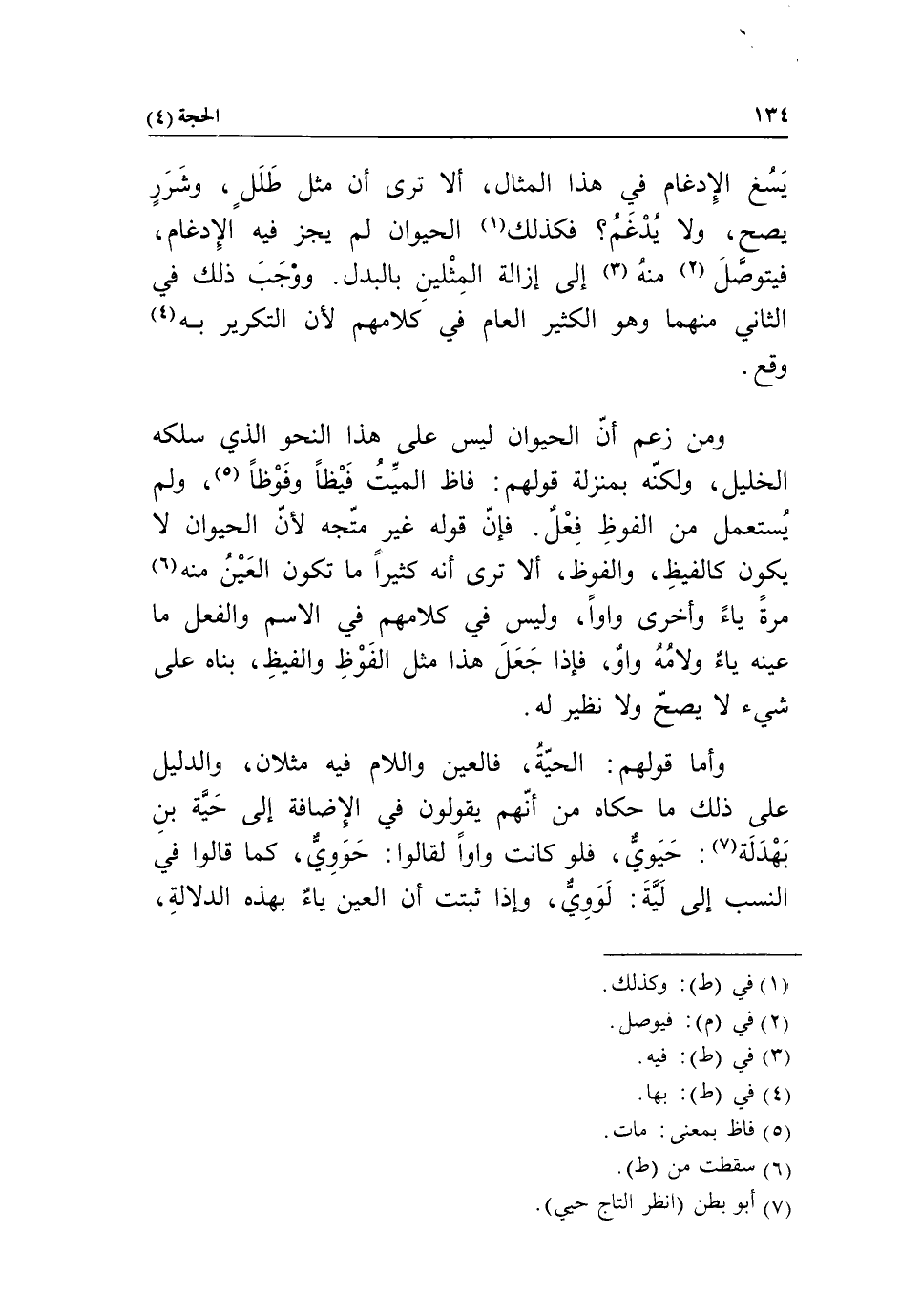 ومن زعم أنّ الحيوان ليس على هذا النحو الذي سلكه الخليل، ولكنّه بمنزلة قولهم: فاظ الميّت فيظا وفوظا «5»، ولم يستعمل من الفوظ فعل. فإنّ قوله غير متّجه لأنّ الحيوان لا يكون كالفيظ، والفوظ، ألا ترى أنه كثيرا ما تكون العين منه «6» مرة ياء وأخرى واوا، وليس في كلامهم في الاسم والفعل ما عينه ياء ولامه واو، فإذا جعل هذا مثل الفوظ والفيظ، بناه على شيء لا يصحّ ولا نظير له.