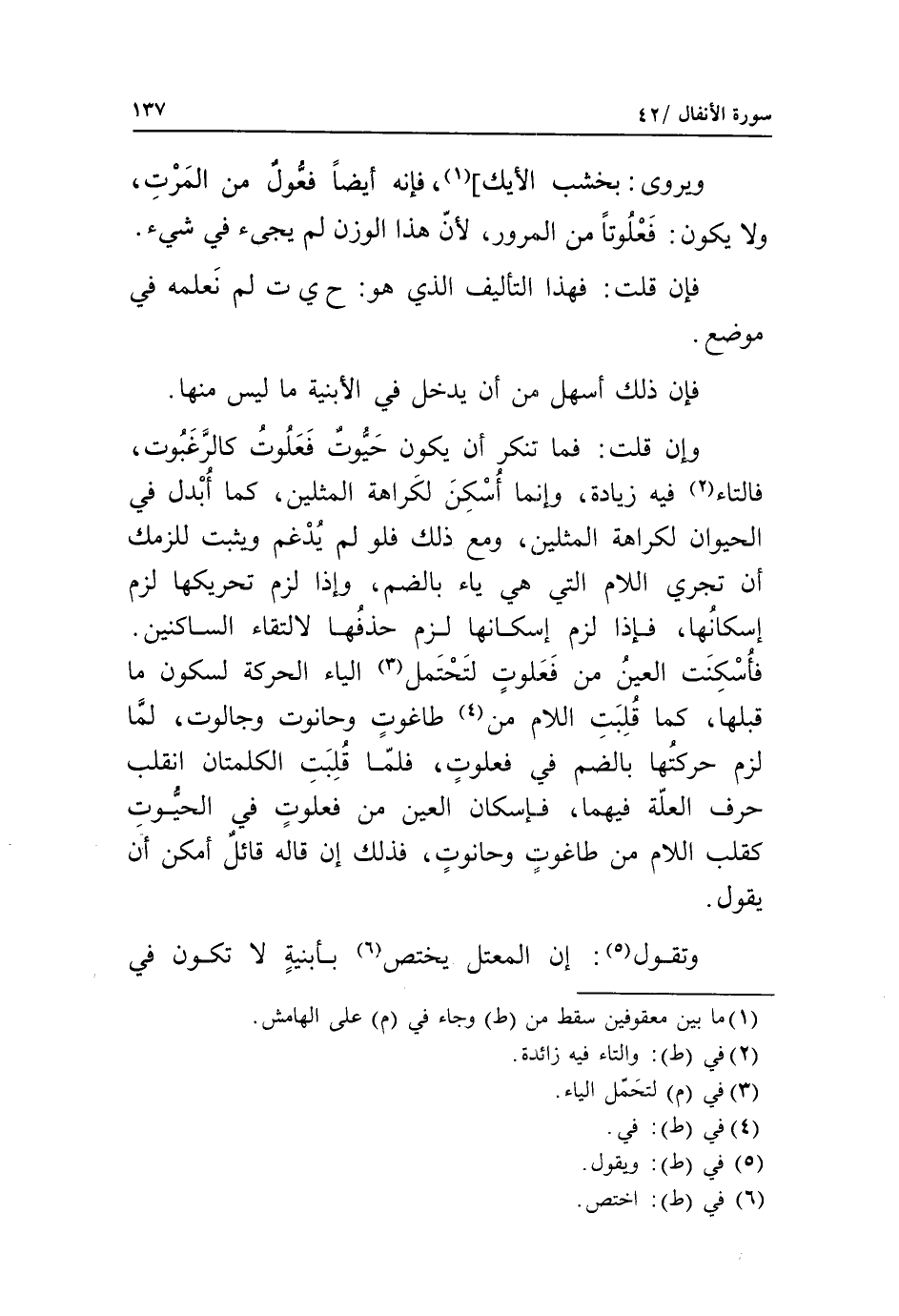 فأسكنت العين من فعلوت لتحتمل «3» الياء الحركة لسكون ما قبلها، كما قلبت اللام من «4» طاغوت وحانوت وجالوت، لمّا لزم حركتها بالضم في فعلوت، فلمّا قلبت الكلمتان انقلب حرف العلّة فيهما، فإسكان العين من فعلوت في الحيّوت كقلب اللام من طاغوت وحانوت، فذلك إن قاله قائل أمكن أن يقول.