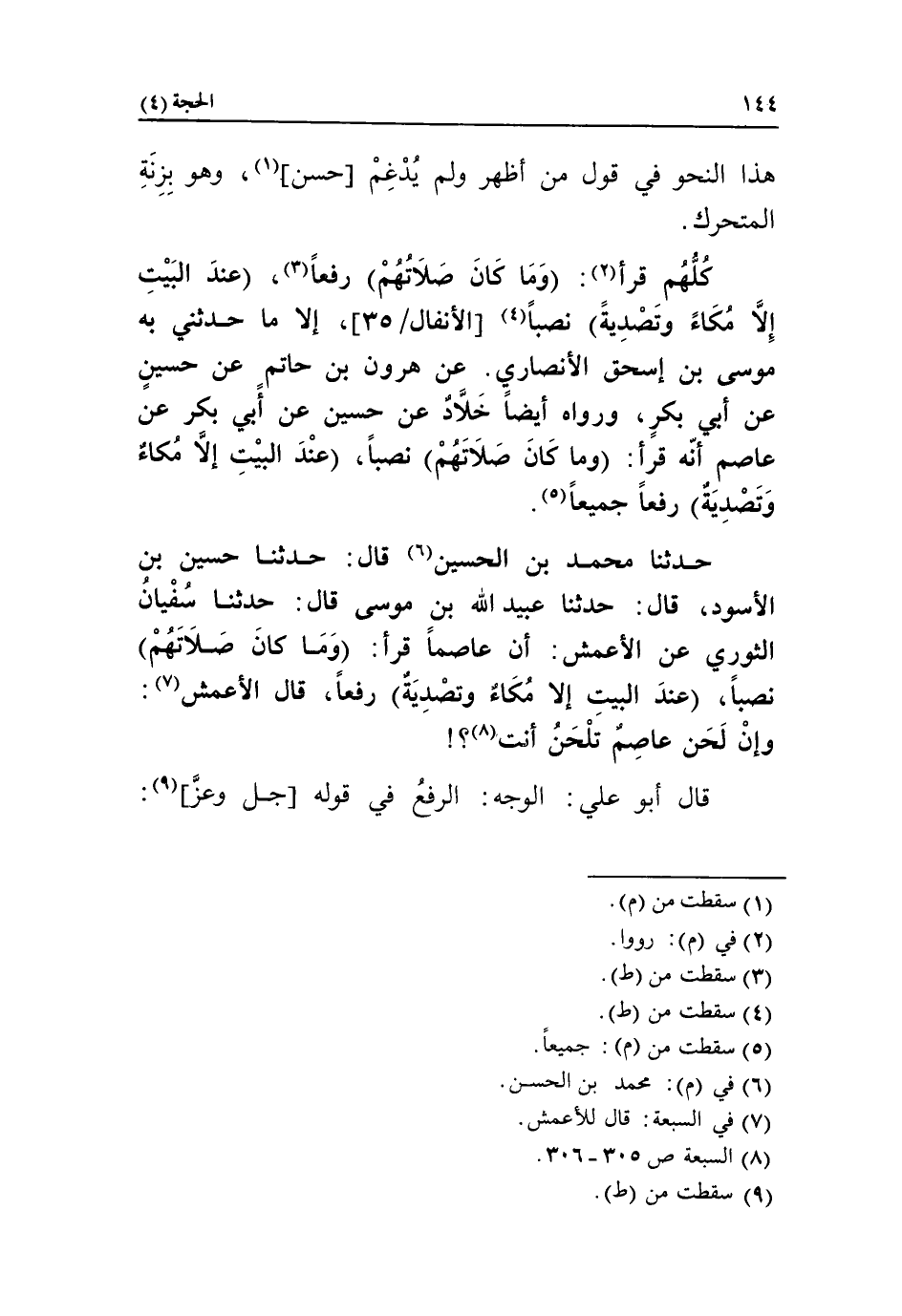 حدثنا محمد بن الحسين «6» قال: حدثنا حسين بن الأسود، قال: حدثنا عبيد الله بن موسى قال: حدثنا سفيان الثوري عن الأعمش: أن عاصما قرأ: وما كان صلاتهم نصبا، عند البيت إلا مكاء وتصدية رفعا، قال الأعمش «7»: