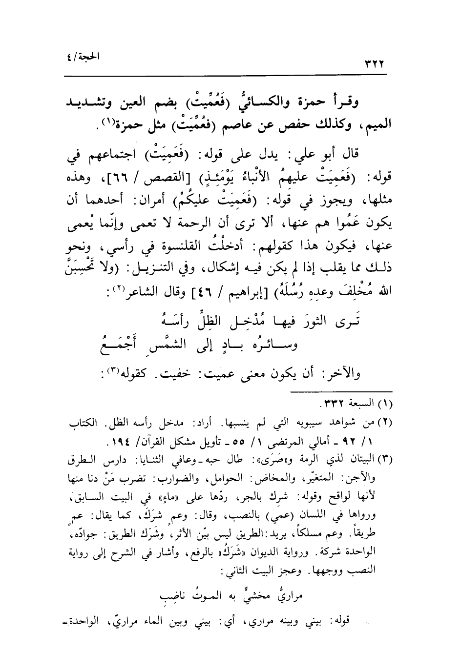 قال أبو علي: يدل على قوله: فعميت* اجتماعهم في قوله: فعميت عليهم الأنباء يومئذ [القصص/ 66]، وهذه مثلها، ويجوز في قوله: فعميت عليكم أمران: أحدهما أن يكون عموا هم عنها، ألا ترى أن الرحمة لا تعمى وإنّما يعمى عنها، فيكون هذا كقولهم: أدخلت القلنسوة في رأسي، ونحو ذلك مما يقلب إذا لم يكن فيه إشكال، وفي التنزيل: ولا تحسبن الله مخلف وعده رسله [إبراهيم/ 46] وقال الشاعر «2»: