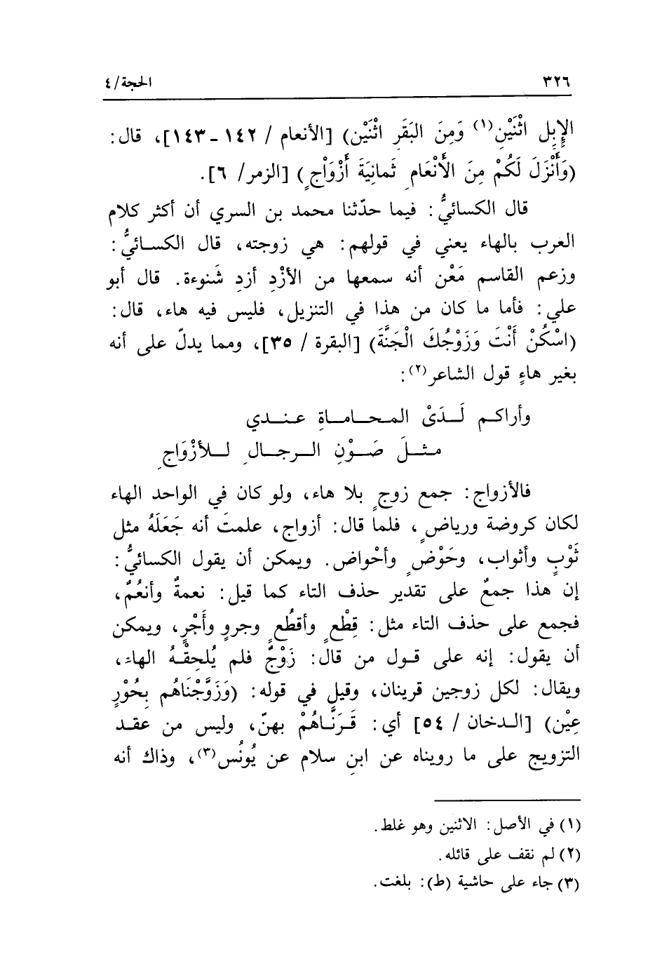 فالأزواج: جمع زوج بلا هاء، ولو كان في الواحد الهاء لكان كروضة ورياض، فلما قال: أزواج، علمت أنه جعله مثل ثوب وأثواب، وحوض وأحواض. ويمكن أن يقول الكسائيّ: